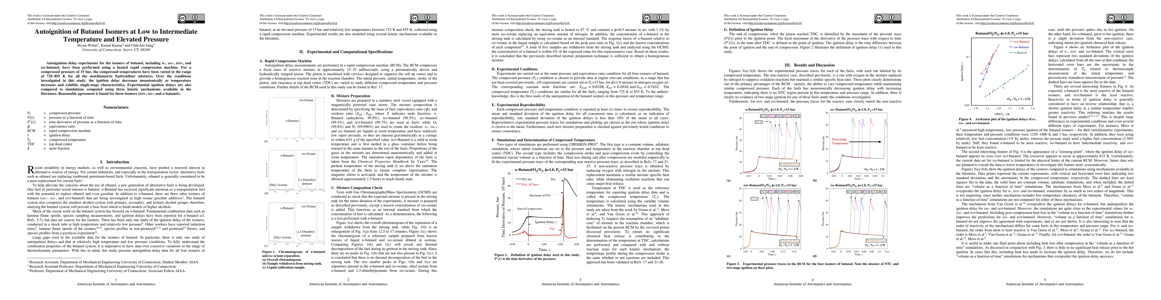 This study investigates the autoignition delays of butanol isomers (n-, sec-, tert-, and iso-butanol) at low to intermediate temperatures and elevated pressures (15 bar, 725-855 K) using a rapid compression machine. The results show a monotonic decrease in ignition delay with increasing temperature and single-stage ignition characteristics, with good agreement between experimental data and simulations for tert-, iso-, and n-butanol.