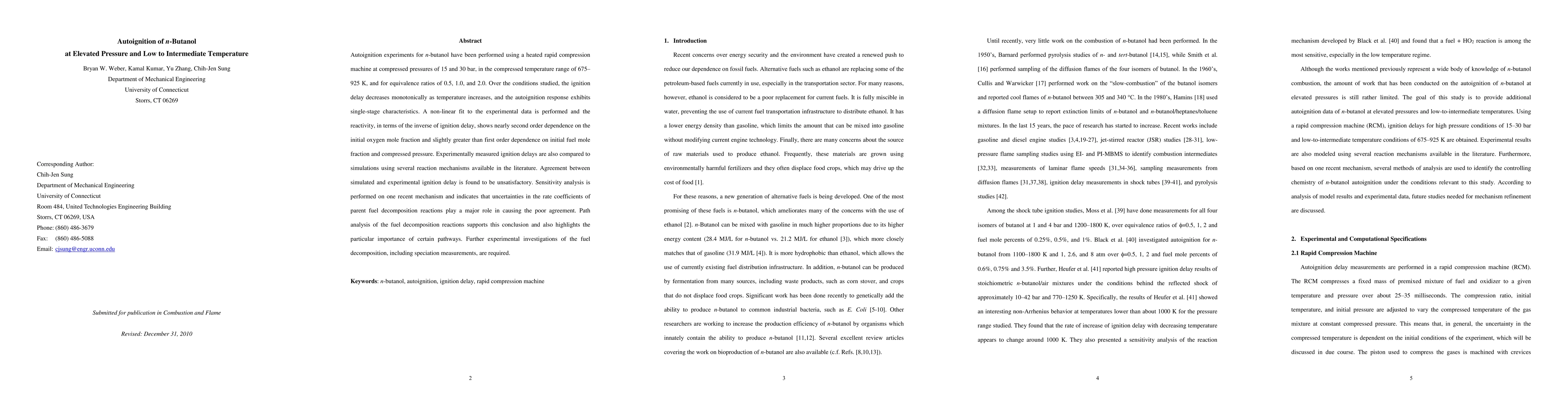 This study investigates the autoignition of n-butanol under elevated pressures and varying temperatures using a rapid compression machine, finding a single-stage ignition response and non-linear reactivity dependence on oxygen and fuel concentrations. Discrepancies between experimental data and existing reaction mechanisms highlight the need for further experimental studies on fuel decomposition pathways.