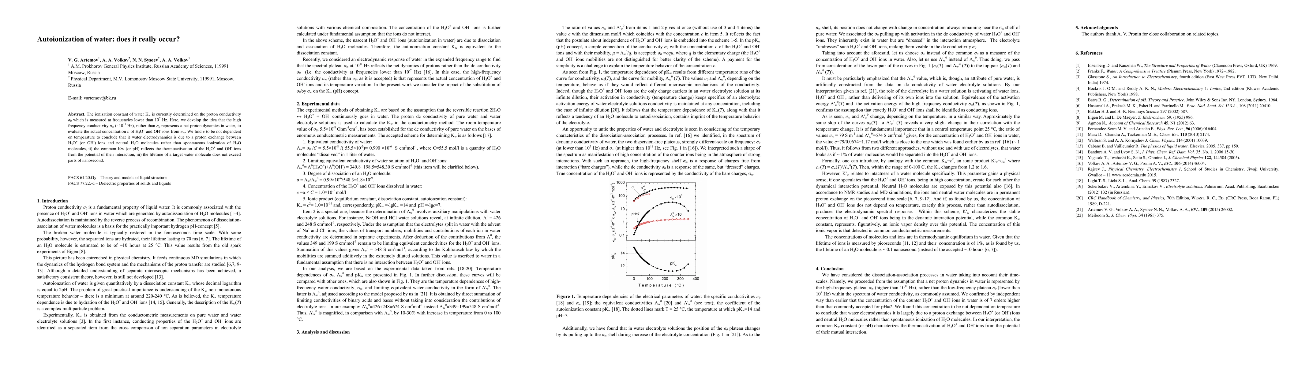 The ionization constant of water Kw is currently determined on the proton conductivity sigma1 which is measured at frequencies lower than 10^7 Hz. Here, we develop the idea that the high frequency conductivity sigma2 (~10^11 Hz), rather than sigma1 represents a net proton dynamics in water, to evaluate the actual concentration c of H3O+ and OH- ions from sigma2. We find c to be not dependent on temperature to conclude that i) water electrodynamics is due to a proton exchange between H3O+ (or OH-) ions and neutral H2O molecules rather than spontaneous ionization of H2O molecules, ii) the common Kw (or pH) reflects the thermoactivation of the H3O+ and OH- ions from the potential of their interaction, iii) the lifetime of a target water molecule does not exceed parts of nanosecond.