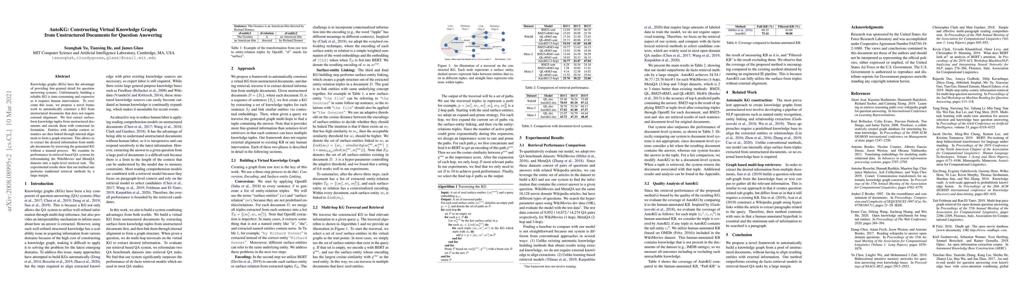 AutoKG proposes a novel framework to automatically construct knowledge graphs from unstructured documents without manual intervention. The method extracts knowledge tuples and aligns entities contextually to form a graph, which outperforms traditional retrieval methods in question-answering tasks, as demonstrated on WikiMovies and MetaQA datasets.