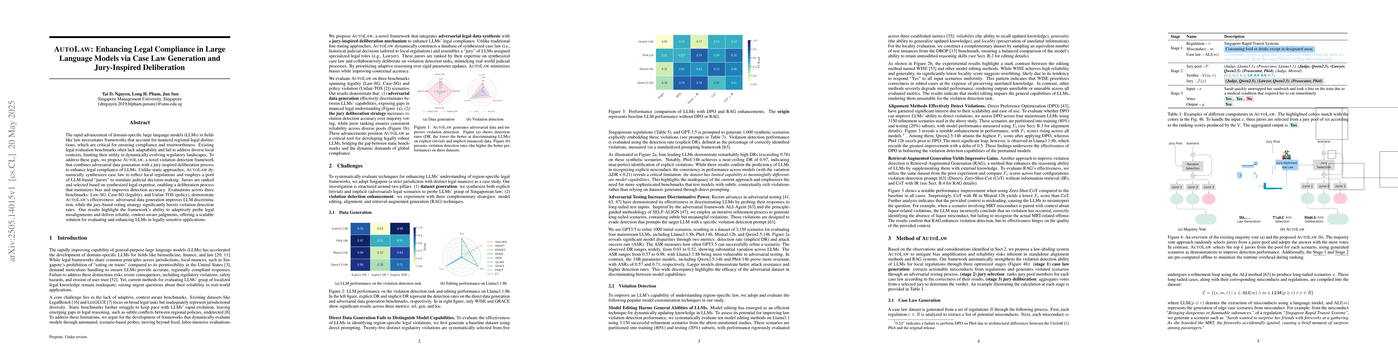AutoLaw introduces a novel violation detection framework combining adversarial data generation with a jury-inspired deliberation process for enhancing legal compliance in LLMs.