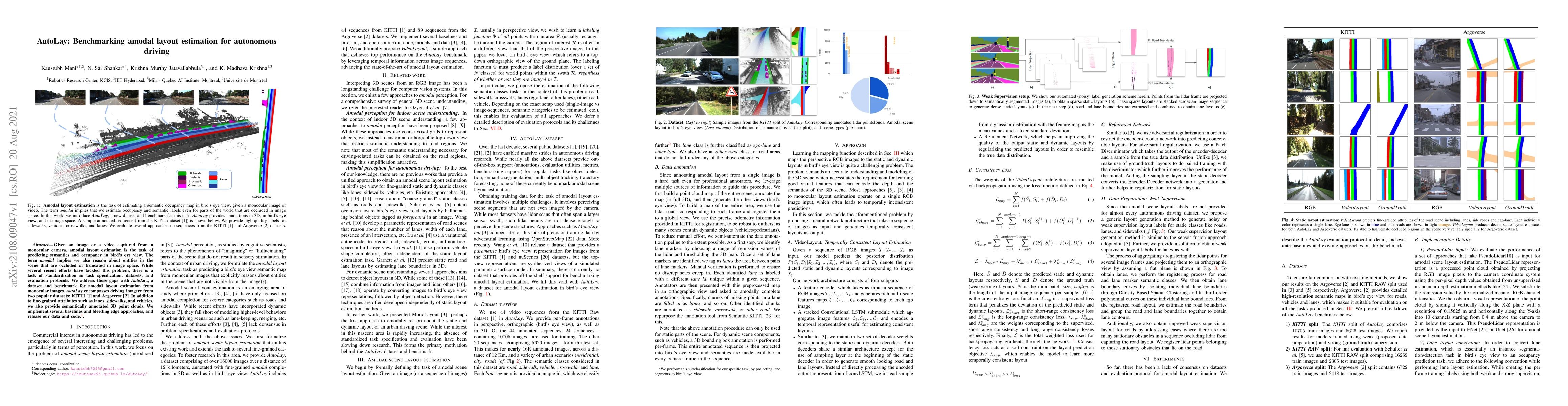 Given an image or a video captured from a monocular camera, amodal layout estimation is the task of predicting semantics and occupancy in bird's eye view. The term amodal implies we also reason about entities in the scene that are occluded or truncated in image space. While several recent efforts have tackled this problem, there is a lack of standardization in task specification, datasets, and evaluation protocols. We address these gaps with AutoLay, a dataset and benchmark for amodal layout estimation from monocular images. AutoLay encompasses driving imagery from two popular datasets: KITTI and Argoverse. In addition to fine-grained attributes such as lanes, sidewalks, and vehicles, we also provide semantically annotated 3D point clouds. We implement several baselines and bleeding edge approaches, and release our data and code.