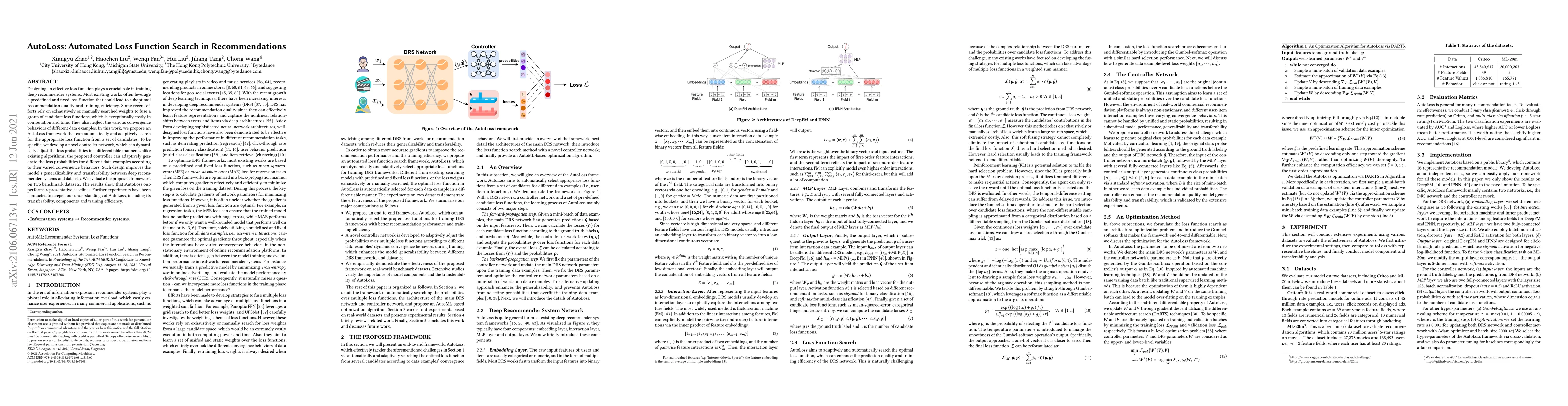 Designing an effective loss function plays a crucial role in training deep recommender systems. Most existing works often leverage a predefined and fixed loss function that could lead to suboptimal recommendation quality and training efficiency. Some recent efforts rely on exhaustively or manually searched weights to fuse a group of candidate loss functions, which is exceptionally costly in computation and time. They also neglect the various convergence behaviors of different data examples. In this work, we propose an AutoLoss framework that can automatically and adaptively search for the appropriate loss function from a set of candidates. To be specific, we develop a novel controller network, which can dynamically adjust the loss probabilities in a differentiable manner. Unlike existing algorithms, the proposed controller can adaptively generate the loss probabilities for different data examples according to their varied convergence behaviors. Such design improves the model's generalizability and transferability between deep recommender systems and datasets. We evaluate the proposed framework on two benchmark datasets. The results show that AutoLoss outperforms representative baselines. Further experiments have been conducted to deepen our understandings of AutoLoss, including its transferability, components and training efficiency.