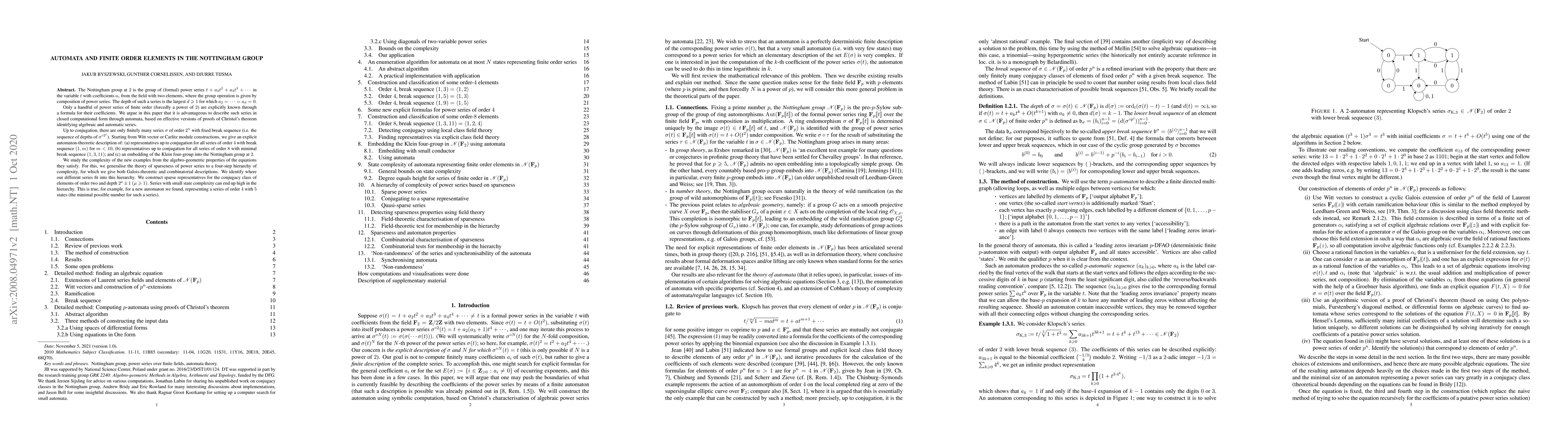 The Nottingham group at 2 is the group of (formal) power series $t+a_2 t^2+ a_3 t^3+ \cdots$ in the variable $t$ with coefficients $a_i$ from the field with two elements, where the group operation is given by composition of power series. The depth of such a series is the largest $d\geq 1$ for which $a_2=\dots=a_d=0$. Only a handful of power series of finite order are explicitly known through a formula for their coefficients. We argue in this paper that it is advantageous to describe such series in closed computational form through automata, based on effective versions of proofs of Christol's theorem identifying algebraic and automatic series. Up to conjugation, there are only finitely many series $\sigma$ of order $2^n$ with fixed break sequence (i.e. the sequence of depths of $\sigma^{\circ 2^i}$). Starting from Witt vector or Carlitz module constructions, we give an explicit automaton-theoretic description of: (a) representatives up to conjugation for all series of order 4 with break sequence (1,m) for m<10; (b) representatives up to conjugation for all series of order 8 with minimal break sequence (1,3,11); and (c) an embedding of the Klein four-group into the Nottingham group at 2. We study the complexity of the new examples from the algebro-geometric properties of the equations they satisfy. For this, we generalise the theory of sparseness of power series to a four-step hierarchy of complexity, for which we give both Galois-theoretic and combinatorial descriptions. We identify where our different series fit into this hierarchy. We construct sparse representatives for the conjugacy class of elements of order two and depth $2^\mu \pm 1$ $(\mu \geq 1)$. Series with small state complexity can end up high in the hierarchy. This is true, for example, for a new automaton we found, representing a series of order 4 with 5 states, the minimal possible number for such a series.