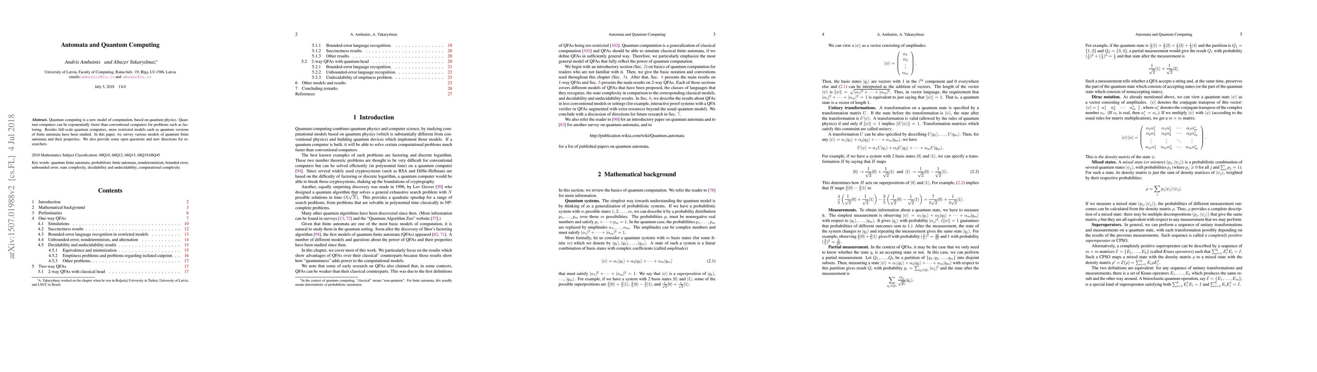 This paper surveys various models of quantum finite automata, exploring their properties and comparing them to probabilistic finite automata. It highlights open questions and suggests new research directions in the field of quantum computing.