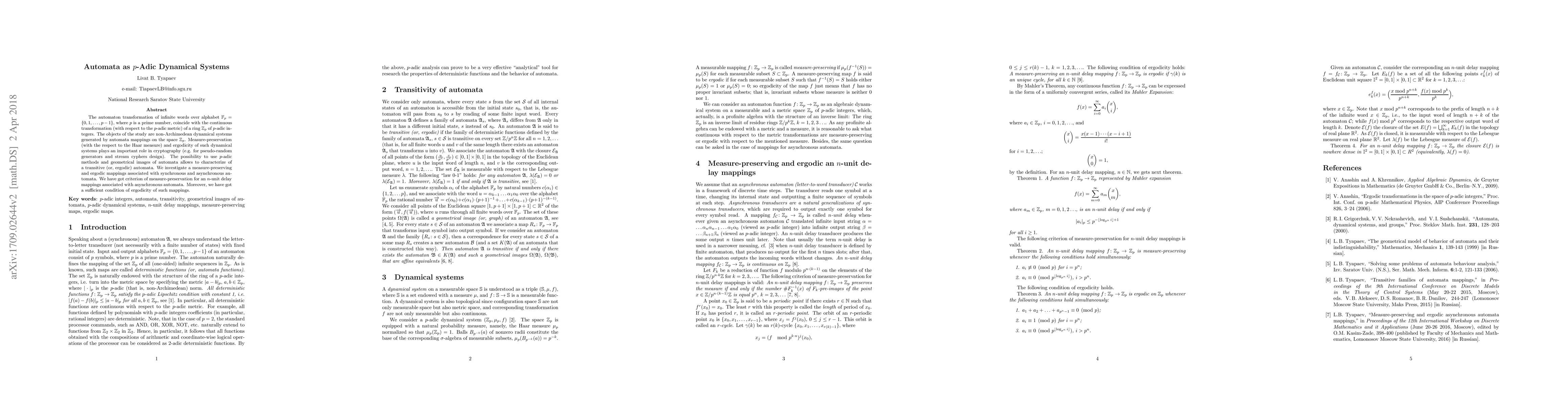 The automaton transformation of infinite words over alphabet $\mathbb F_p=\{0,1,\ldots,p-1\}$, where $p$ is a prime number, coincide with the continuous transformation (with respect to the $p$-adic metric) of a ring $\mathbb Z_p$ of $p$-adic integers. The objects of the study are non-Archimedean dynamical systems generated by automata mappings on the space $\mathbb Z_p$. Measure-preservation (with the respect to the Haar measure) and ergodicity of such dynamical systems plays an important role in cryptography (e.g. for pseudorandom generators and stream cyphers design). The possibility to use $p$-adic methods and geometrical images of automata allows to characterize of a transitive (or, ergodic) automata. We investigate a measure-preserving and ergodic mappings associated with synchronous and asynchronous automata. We have got criterion of measure-preservation for an $n$-unit delay mappings associated with asynchronous automata. Moreover, we have got a sufficient condition of ergodicity of such mappings.