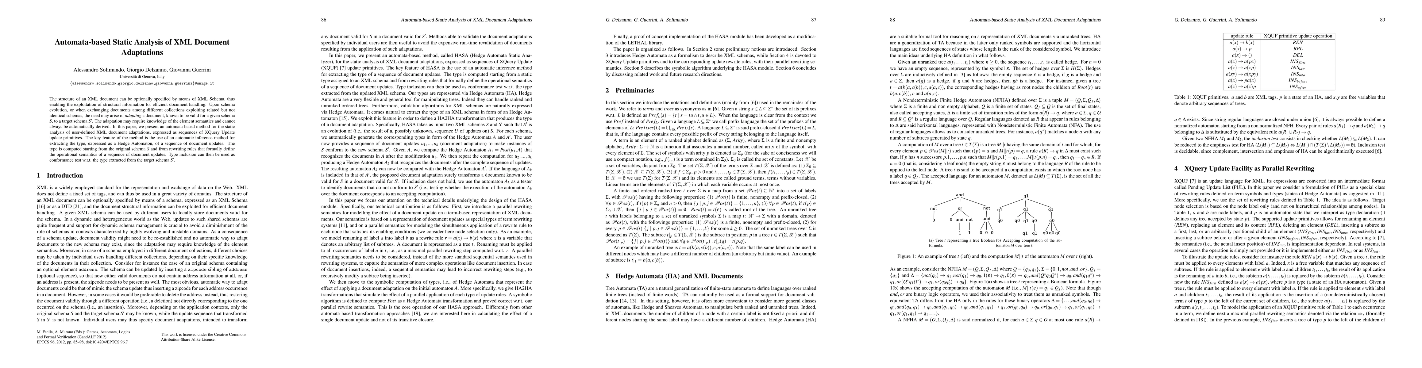 This paper proposes an automata-based method for statically analyzing XML document adaptations using XQuery Update primitives. It leverages Hedge Automata to infer the type of update sequences, enabling conformance testing against target schema adaptations.