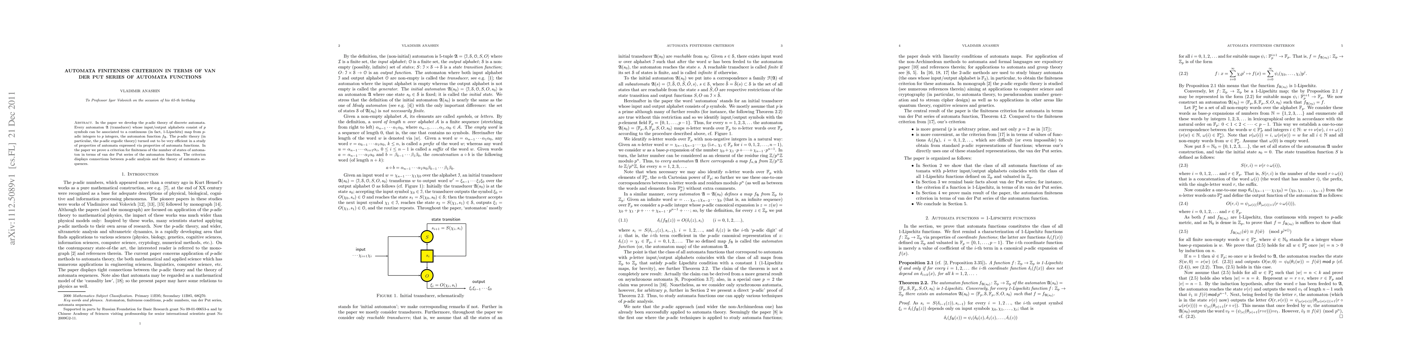 In the paper we develop the $p$-adic theory of discrete automata. Every automaton $\mathfrak A$ (transducer) whose input/output alphabets consist of $p$ symbols can be associated to a continuous (in fact, 1-Lipschitz) map from $p$-adic integers to $p$ integers, the automaton function $f_\mathfrak A$. The $p$-adic theory (in particular, the $p$-adic ergodic theory) turned out to be very efficient in a study of properties of automata expressed via properties of automata functions. In the paper we prove a criterion for finiteness of the number of states of automaton in terms of van der Put series of the automaton function. The criterion displays connections between $p$-adic analysis and the theory of automata sequences.