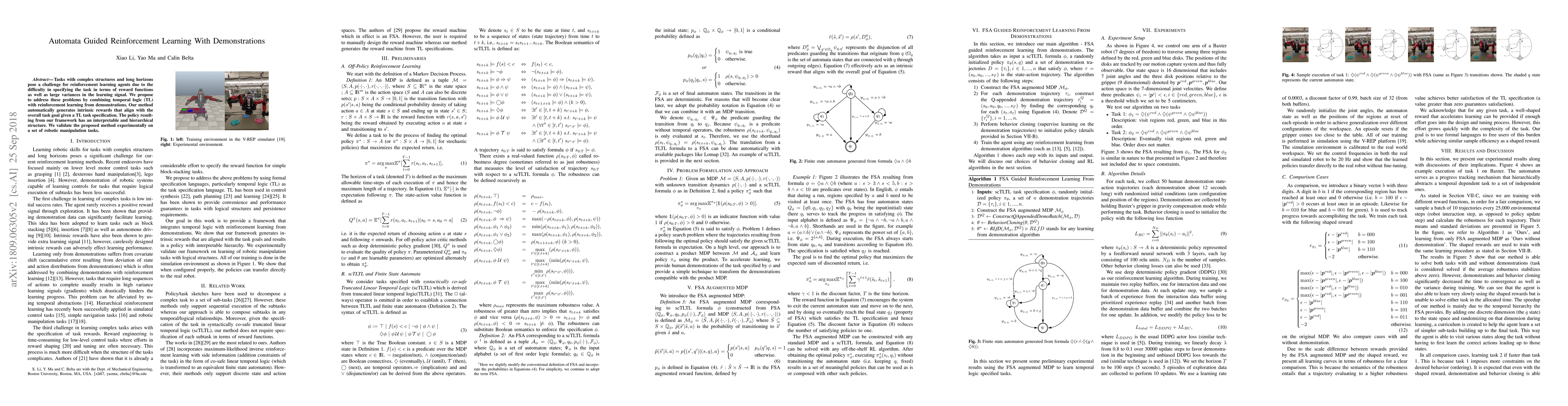 This paper combines temporal logic with reinforcement learning from demonstrations to generate intrinsic rewards that align with task goals, resulting in an interpretable and hierarchical policy structure. Experimental validation on robotic manipulation tasks shows the effectiveness of the proposed method.