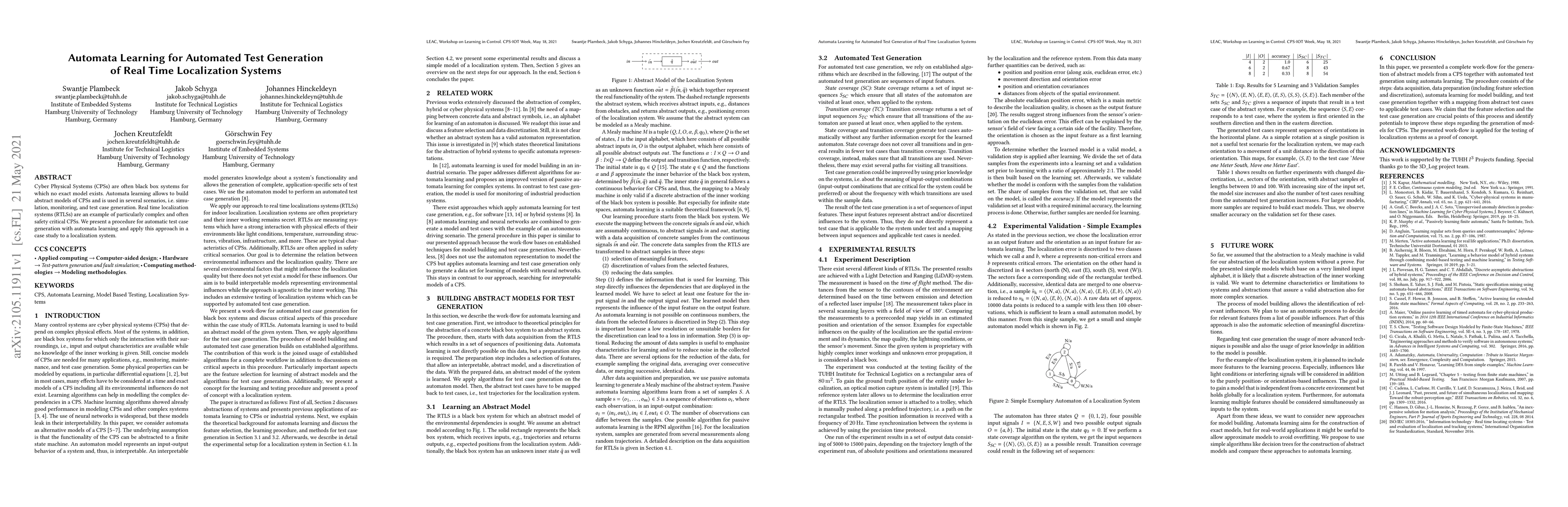 This paper proposes an automata learning method for automated test case generation in real time localization systems, which are complex and safety-critical Cyber Physical Systems lacking exact models. The method is demonstrated through a case study application to a localization system.