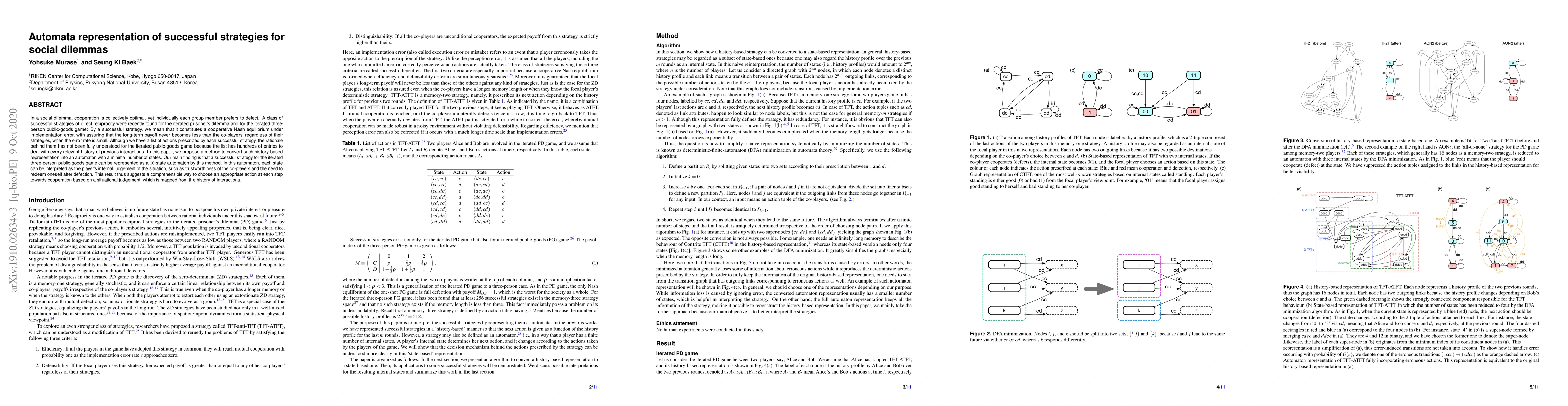 In a social dilemma, cooperation is collectively optimal, yet individually each group member prefers to defect. A class of successful strategies of direct reciprocity were recently found for the iterated prisoner's dilemma and for the iterated three-person public-goods game: By a successful strategy, we mean that it constitutes a cooperative Nash equilibrium under implementation error, with assuring that the long-term payoff never becomes less than the co-players' regardless of their strategies, when the error rate is small. Although we have a list of actions prescribed by each successful strategy, the rationale behind them has not been fully understood for the iterated public-goods game because the list has hundreds of entries to deal with every relevant history of previous interactions. In this paper, we propose a method to convert such history-based representation into an automaton with a minimal number of states. Our main finding is that a successful strategy for the iterated three-person public-goods game can be represented as a $10$-state automaton by this method. In this automaton, each state can be interpreted as the player's internal judgement of the situation, such as trustworthiness of the co-players and the need to redeem oneself after defection. This result thus suggests a comprehensible way to choose an appropriate action at each step towards cooperation based on a situational judgement, which is mapped from the history of interactions.