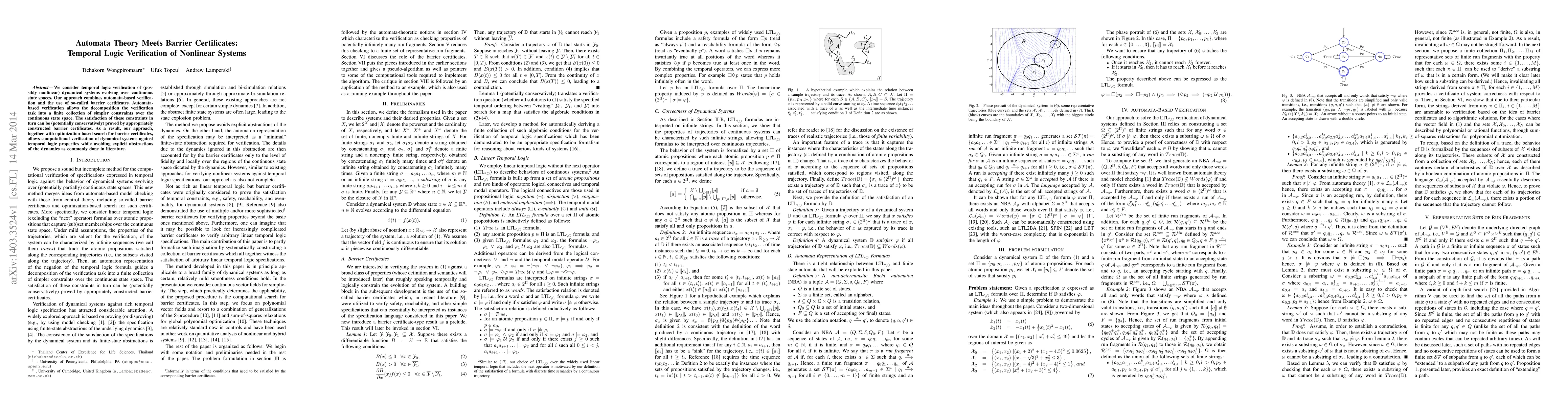 The paper proposes a method for temporal logic verification of nonlinear dynamical systems using automata-based verification combined with barrier certificates, enabling computational verification without explicit dynamic abstractions. The approach decomposes verification into simpler constraints, which are then verified using optimization-based search for barrier certificates.