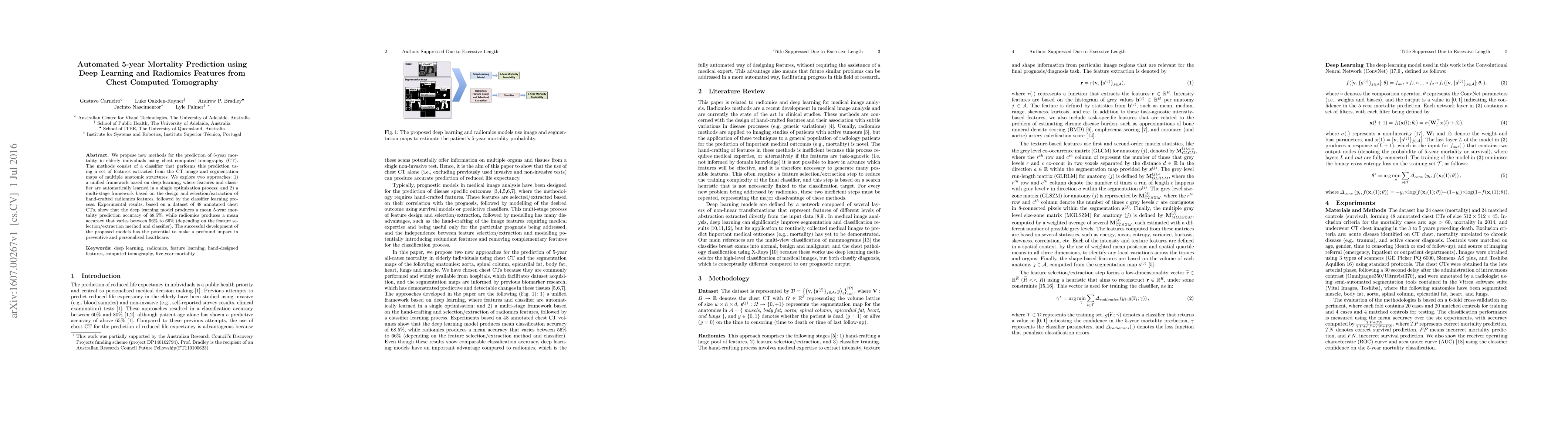 This paper proposes two methods for predicting 5-year mortality in elderly individuals using chest CT scans: a deep learning approach and a radiomics-based method. The deep learning model achieves a mean accuracy of 68.5% compared to 56% to 66% for radiomics, highlighting the potential for advanced predictive analytics in healthcare.