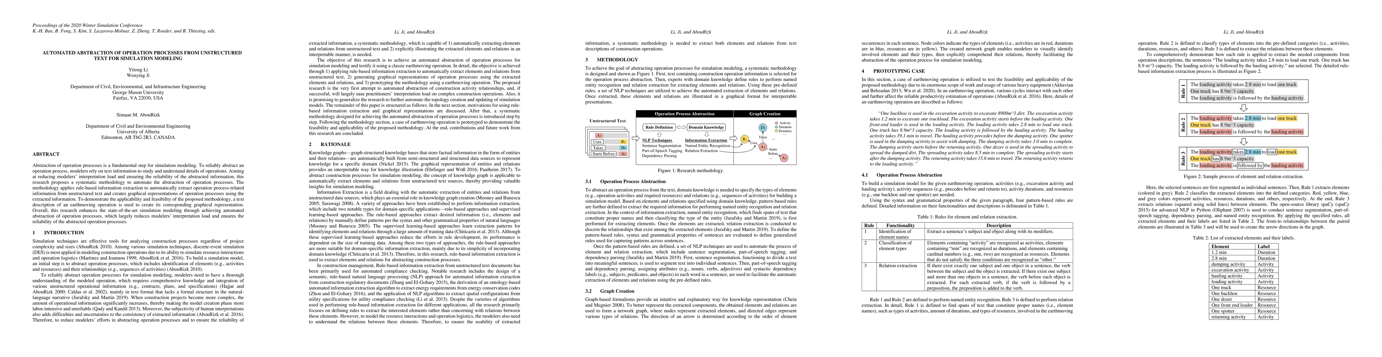 Abstraction of operation processes is a fundamental step for simulation modeling. To reliably abstract an operation process, modelers rely on text information to study and understand details of operations. Aiming at reducing modelers' interpretation load and ensuring the reliability of the abstracted information, this research proposes a systematic methodology to automate the abstraction of operation processes. The methodology applies rule-based information extraction to automatically extract operation process-related information from unstructured text and creates graphical representations of operation processes using the extracted information. To demonstrate the applicability and feasibility of the proposed methodology, a text description of an earthmoving operation is used to create its corresponding graphical representation. Overall, this research enhances the state-of-the-art simulation modeling through achieving automated abstraction of operation processes, which largely reduces modelers' interpretation load and ensures the reliability of the abstracted operation processes.