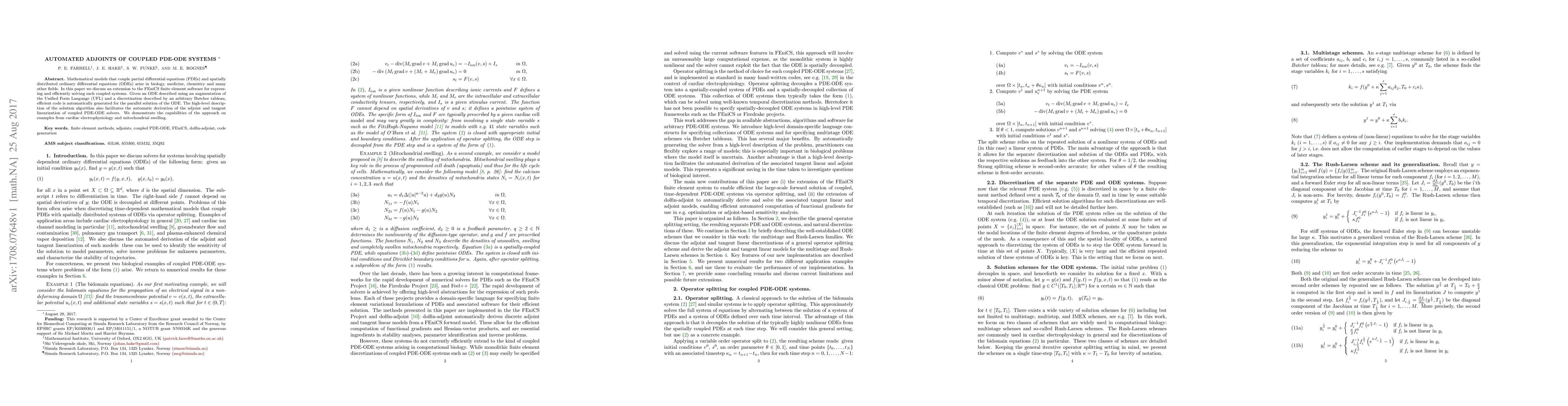This paper extends FEniCS to efficiently solve coupled PDE-ODE systems by automatically generating parallel solvers and deriving adjoints and tangent linearizations. Demonstrated on cardiac electrophysiology and mitochondrial swelling models, the approach enhances computational efficiency and accuracy.
