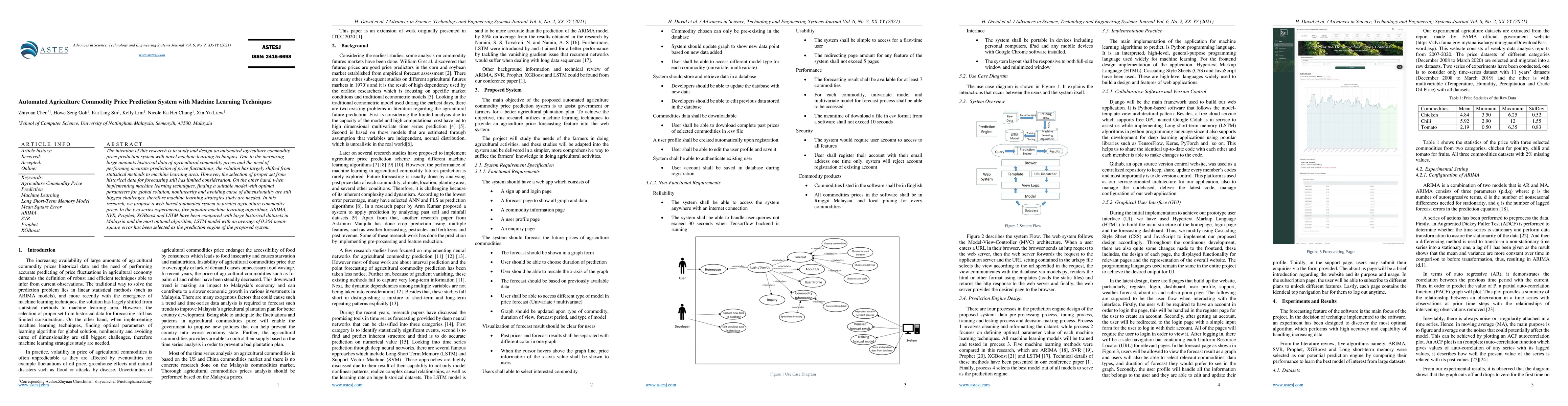The intention of this research is to study and design an automated agriculture commodity price prediction system with novel machine learning techniques. Due to the increasing large amounts historical data of agricultural commodity prices and the need of performing accurate prediction of price fluctuations, the solution has largely shifted from statistical methods to machine learning area. However, the selection of proper set from historical data for forecasting still has limited consideration. On the other hand, when implementing machine learning techniques, finding a suitable model with optimal parameters for global solution, nonlinearity and avoiding curse of dimensionality are still biggest challenges, therefore machine learning strategies study are needed. In this research, we propose a web-based automated system to predict agriculture commodity price. In the two series experiments, five popular machine learning algorithms, ARIMA, SVR, Prophet, XGBoost and LSTM have been compared with large historical datasets in Malaysia and the most optimal algorithm, LSTM model with an average of 0.304 mean-square error has been selected as the prediction engine of the proposed system.