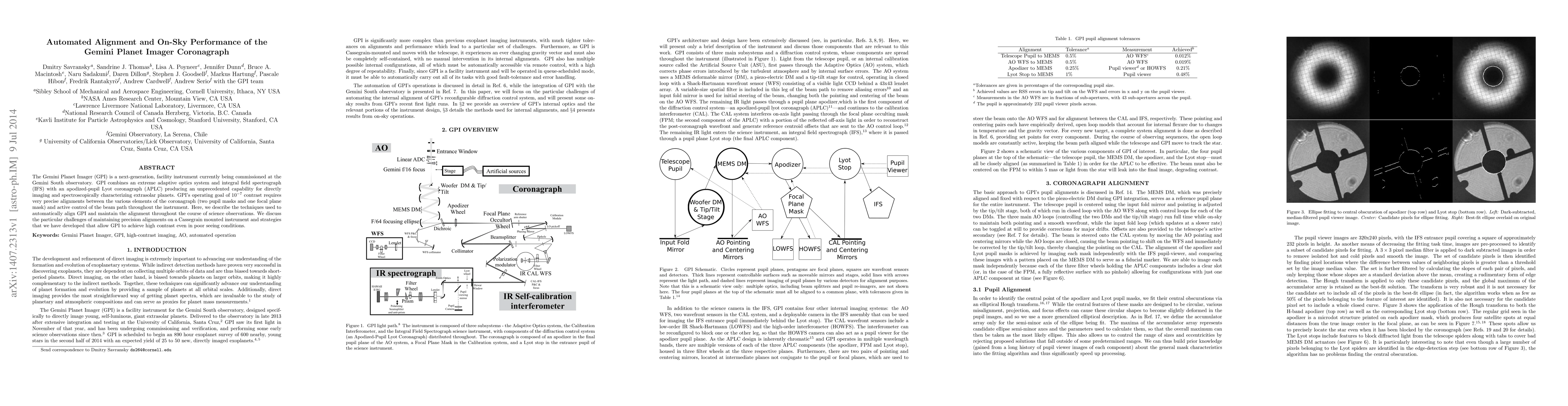 This paper details the automated alignment techniques and on-sky performance of the Gemini Planet Imager (GPI) coronagraph, which combines adaptive optics and an integral field spectrograph to achieve high contrast for directly imaging exoplanets. The authors describe methods for maintaining precise alignments and active control to achieve GPI's operating goal of $10^{-7}$ contrast, even in challenging seeing conditions.