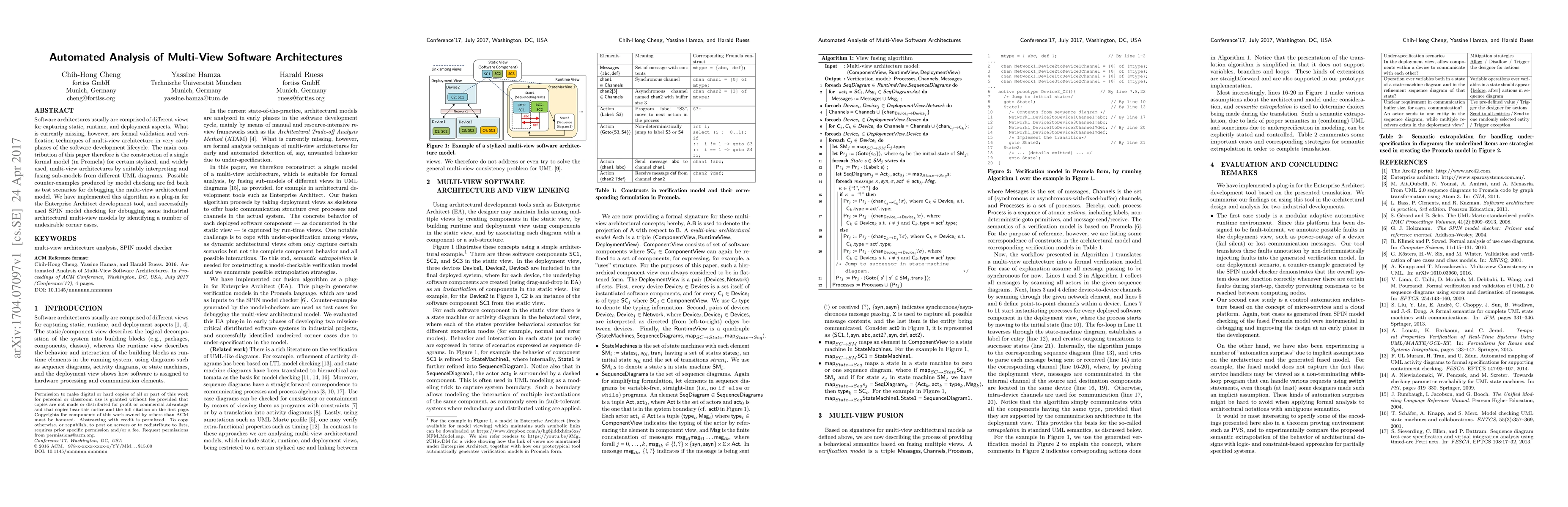 This paper proposes a formal model for validating multi-view software architectures using Promela and SPIN model checking, and implements it as a plug-in for Enterprise Architect to identify and debug architectural issues early in the development lifecycle. The approach successfully identified undesirable corner cases in industrial models.