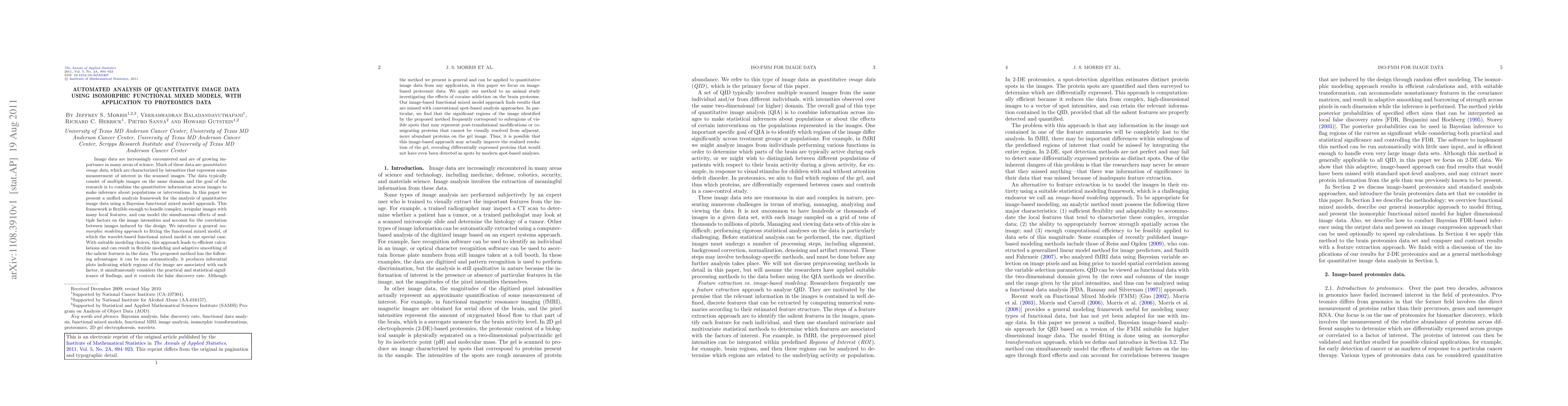 This paper introduces a Bayesian functional mixed model for automated analysis of quantitative image data, employing an isomorphic modeling approach to handle complex images and multiple factors. The method facilitates efficient calculations, adaptive smoothing, and controls the false discovery rate, making it useful for proteomics data analysis.