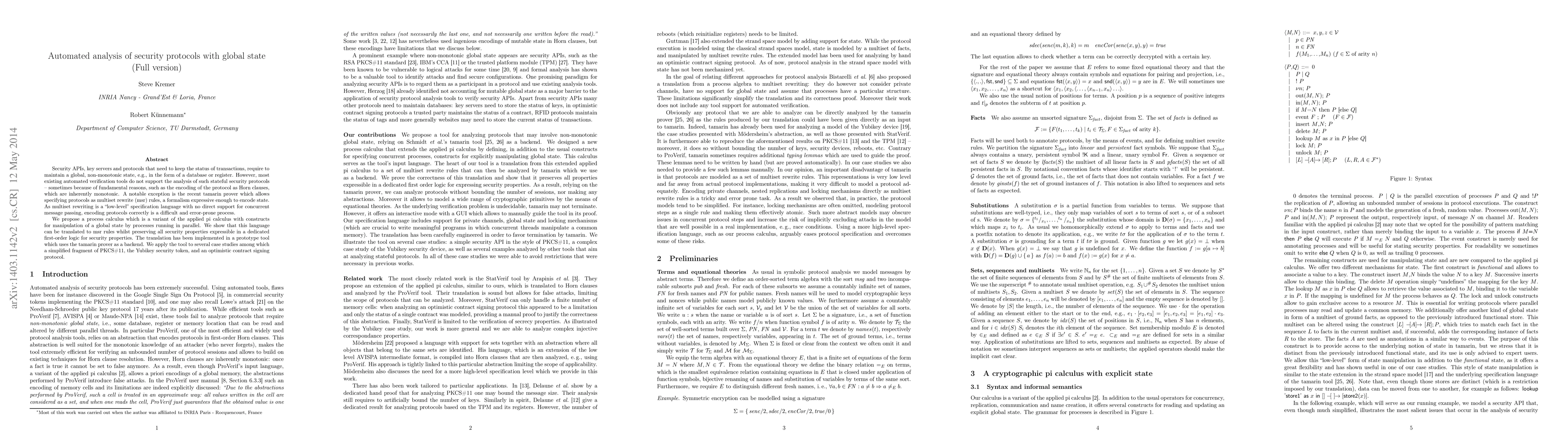 This paper proposes a process calculus for specifying stateful security protocols that can be translated to multiset rewrite rules, enabling automated verification using the tamarin prover. The approach is demonstrated through a prototype tool applied to several case studies, including PKCS\#11 and Yubikey protocols.