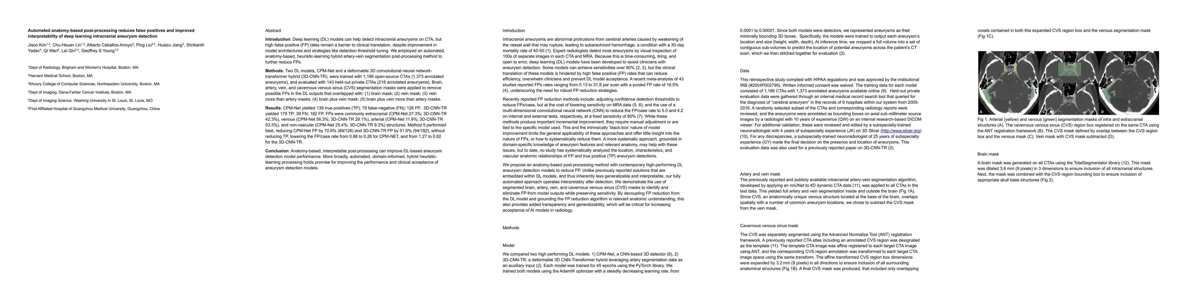 This research introduces an anatomy-based post-processing method to reduce false positives in deep learning (DL) models detecting intracranial aneurysms on CT angiography (CTA). Using two DL models, CPM-Net and 3D-CNN-TR, and applying brain, artery, vein, and cavernous venous sinus segmentation masks, the method successfully decreased false positives by 70.6% for CPM-Net and 51.6% for 3D-CNN-TR, without compromising true positives. This approach enhances interpretability and clinical acceptance of aneurysm detection models.