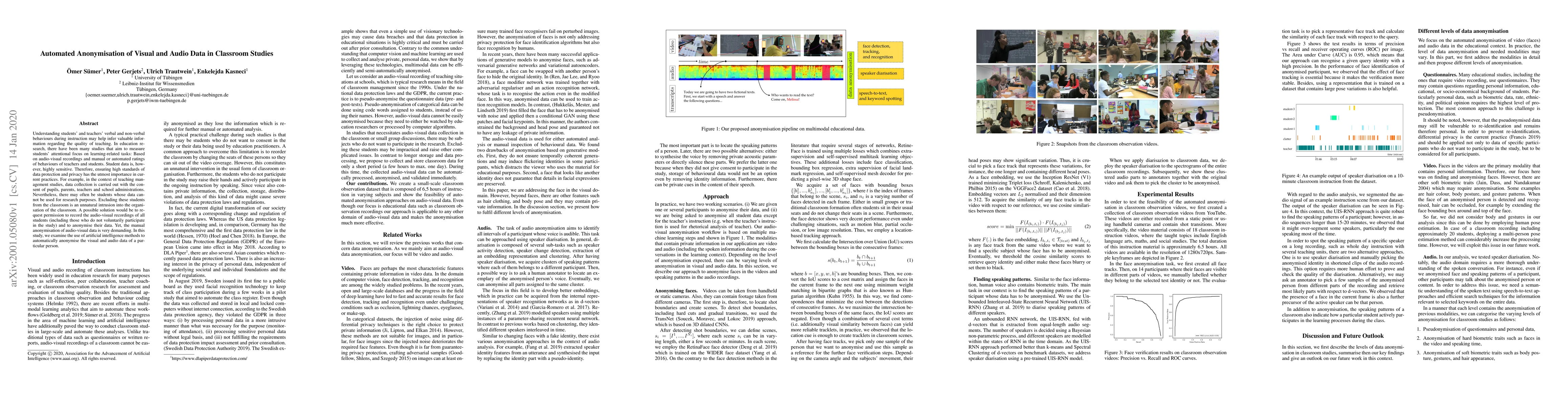 Understanding students' and teachers' verbal and non-verbal behaviours during instruction may help infer valuable information regarding the quality of teaching. In education research, there have been many studies that aim to measure students' attentional focus on learning-related tasks: Based on audio-visual recordings and manual or automated ratings of behaviours of teachers and students. Student data is, however, highly sensitive. Therefore, ensuring high standards of data protection and privacy has the utmost importance in current practices. For example, in the context of teaching management studies, data collection is carried out with the consent of pupils, parents, teachers and school administrations. Nevertheless, there may often be students whose data cannot be used for research purposes. Excluding these students from the classroom is an unnatural intrusion into the organisation of the classroom. A possible solution would be to request permission to record the audio-visual recordings of all students (including those who do not voluntarily participate in the study) and to anonymise their data. Yet, the manual anonymisation of audio-visual data is very demanding. In this study, we examine the use of artificial intelligence methods to automatically anonymise the visual and audio data of a particular person.