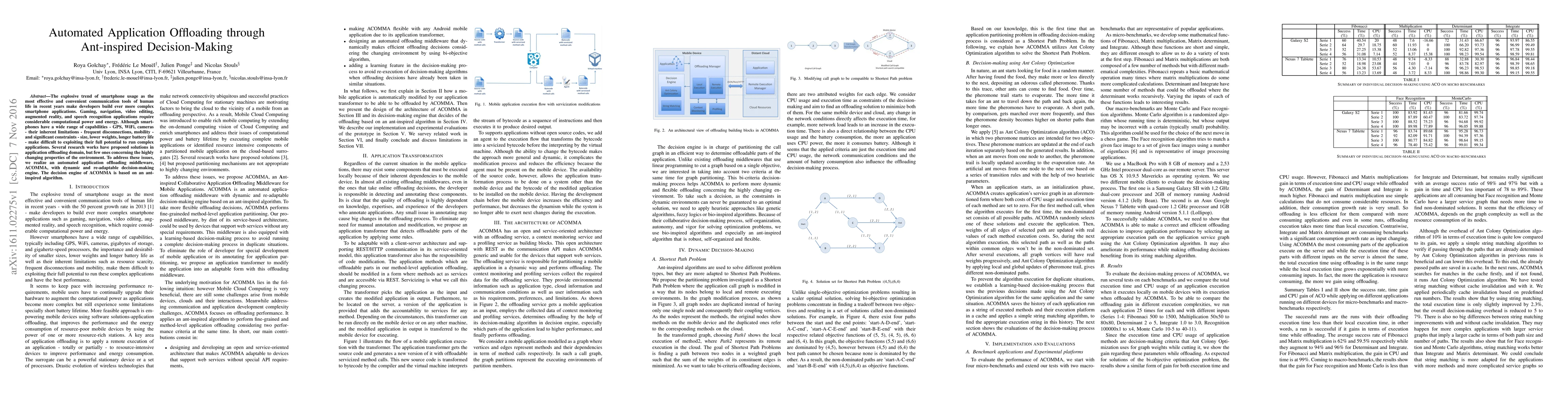 -The explosive trend of smartphone usage as the most effective and convenient communication tools of human life in recent years make developers build ever more complex smartphone applications. Gaming, navigation, video editing, augmented reality, and speech recognition applications require considerable computational power and energy. Although smart- phones have a wide range of capabilities - GPS, WiFi, cameras - their inherent limitations - frequent disconnections, mobility - and significant constraints - size, lower weights, longer battery life - make difficult to exploiting their full potential to run complex applications. Several research works have proposed solutions in application offloading domain, but few ones concerning the highly changing properties of the environment. To address these issues, we realize an automated application offloading middleware, ACOMMA, with dynamic and re-adaptable decision-making engine. The decision engine of ACOMMA is based on an ant- inspired algorithm.