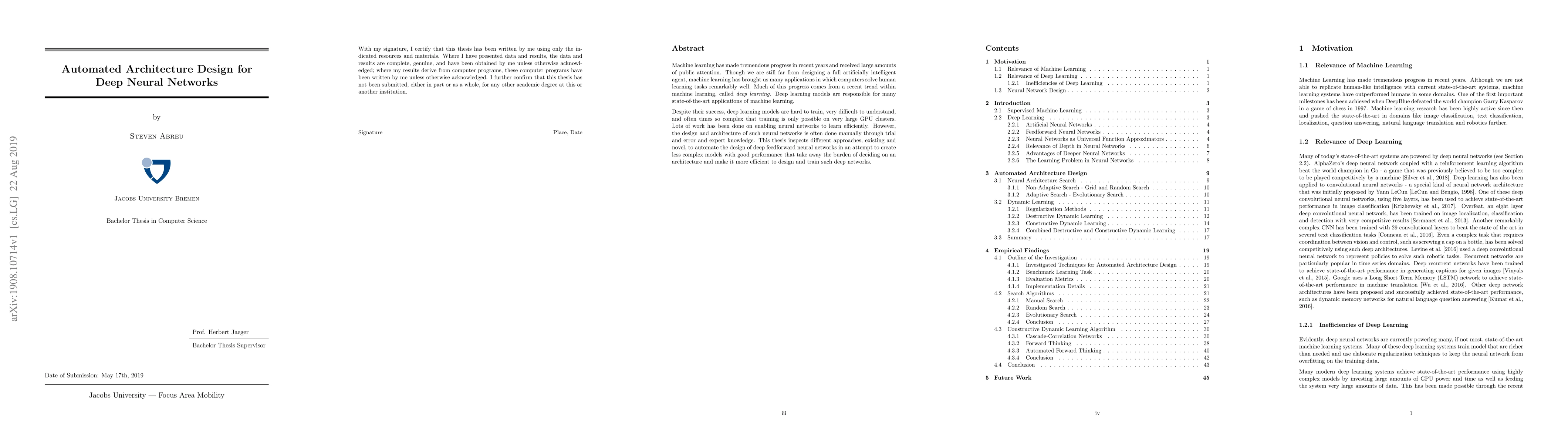 This research is significant as it explores methods to automate the design of deep neural networks, reducing the reliance on manual expertise and computational resources, and potentially leading to more efficient and accessible machine learning applications.
