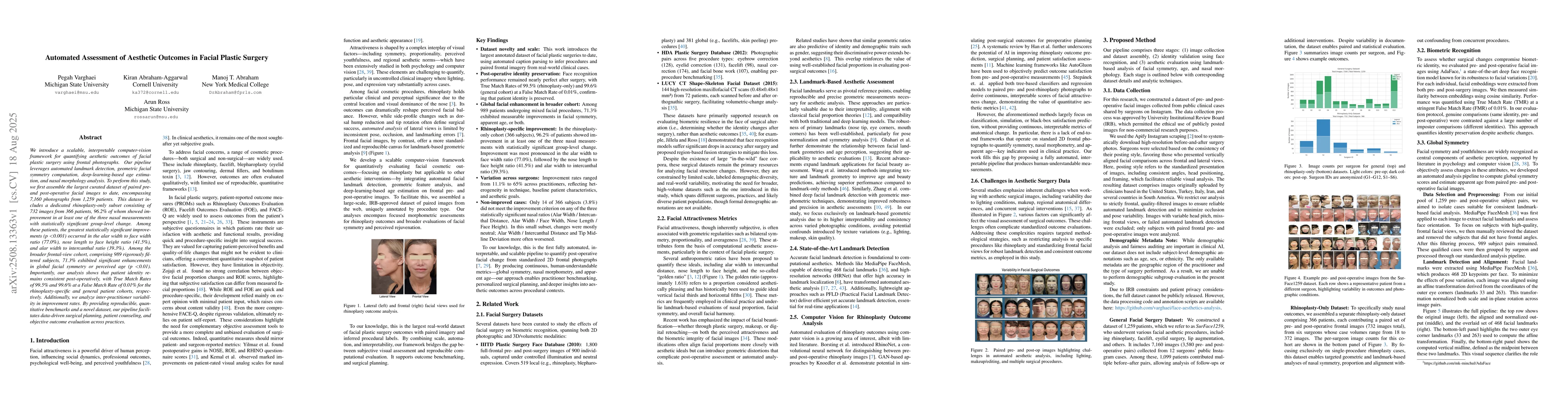 We introduce a scalable, interpretable computer-vision framework for quantifying aesthetic outcomes of facial plastic surgery using frontal photographs. Our pipeline leverages automated landmark detection, geometric facial symmetry computation, deep-learning-based age estimation, and nasal morphology analysis. To perform this study, we first assemble the largest curated dataset of paired pre- and post-operative facial images to date, encompassing 7,160 photographs from 1,259 patients. This dataset includes a dedicated rhinoplasty-only subset consisting of 732 images from 366 patients, 96.2% of whom showed improvement in at least one of the three nasal measurements with statistically significant group-level change. Among these patients, the greatest statistically significant improvements (p < 0.001) occurred in the alar width to face width ratio (77.0%), nose length to face height ratio (41.5%), and alar width to intercanthal ratio (39.3%). Among the broader frontal-view cohort, comprising 989 rigorously filtered subjects, 71.3% exhibited significant enhancements in global facial symmetry or perceived age (p < 0.01). Importantly, our analysis shows that patient identity remains consistent post-operatively, with True Match Rates of 99.5% and 99.6% at a False Match Rate of 0.01% for the rhinoplasty-specific and general patient cohorts, respectively. Additionally, we analyze inter-practitioner variability in improvement rates. By providing reproducible, quantitative benchmarks and a novel dataset, our pipeline facilitates data-driven surgical planning, patient counseling, and objective outcome evaluation across practices.