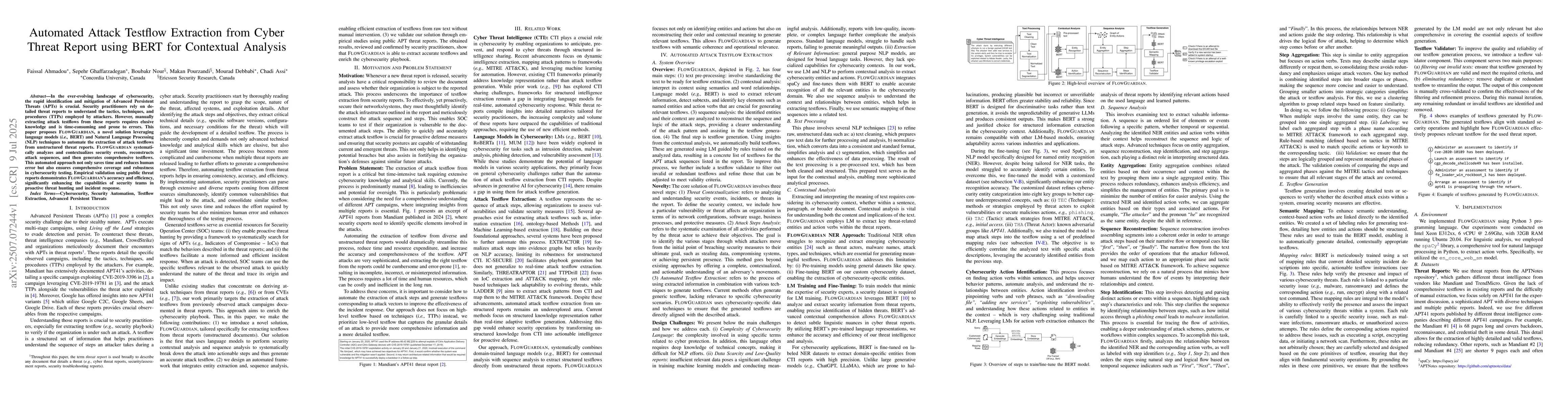 In the ever-evolving landscape of cybersecurity, the rapid identification and mitigation of Advanced Persistent Threats (APTs) is crucial. Security practitioners rely on detailed threat reports to understand the tactics, techniques, and procedures (TTPs) employed by attackers. However, manually extracting attack testflows from these reports requires elusive knowledge and is time-consuming and prone to errors. This paper proposes FLOWGUARDIAN, a novel solution leveraging language models (i.e., BERT) and Natural Language Processing (NLP) techniques to automate the extraction of attack testflows from unstructured threat reports. FLOWGUARDIAN systematically analyzes and contextualizes security events, reconstructs attack sequences, and then generates comprehensive testflows. This automated approach not only saves time and reduces human error but also ensures comprehensive coverage and robustness in cybersecurity testing. Empirical validation using public threat reports demonstrates FLOWGUARDIAN's accuracy and efficiency, significantly enhancing the capabilities of security teams in proactive threat hunting and incident response.