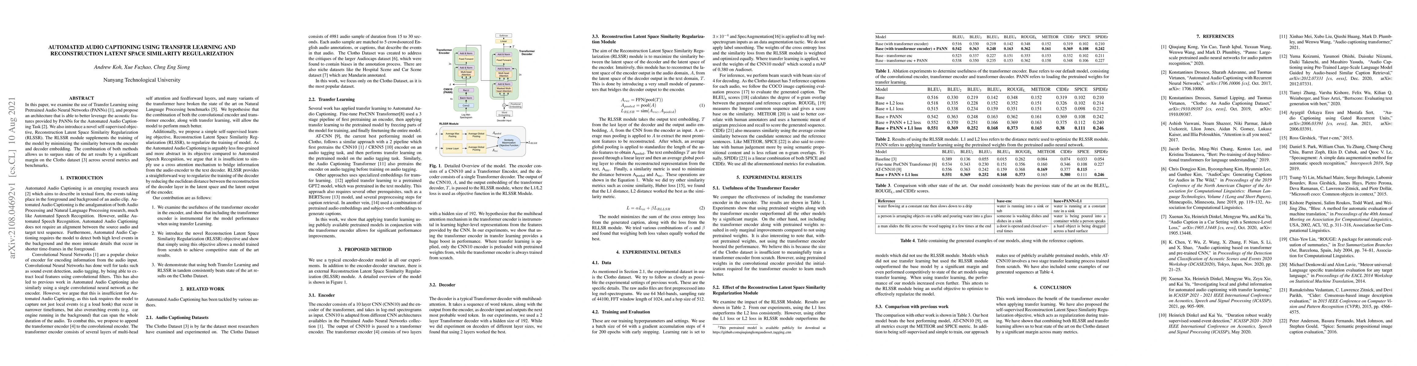 In this paper, we examine the use of Transfer Learning using Pretrained Audio Neural Networks (PANNs), and propose an architecture that is able to better leverage the acoustic features provided by PANNs for the Automated Audio Captioning Task. We also introduce a novel self-supervised objective, Reconstruction Latent Space Similarity Regularization (RLSSR). The RLSSR module supplements the training of the model by minimizing the similarity between the encoder and decoder embedding. The combination of both methods allows us to surpass state of the art results by a significant margin on the Clotho dataset across several metrics and benchmarks.