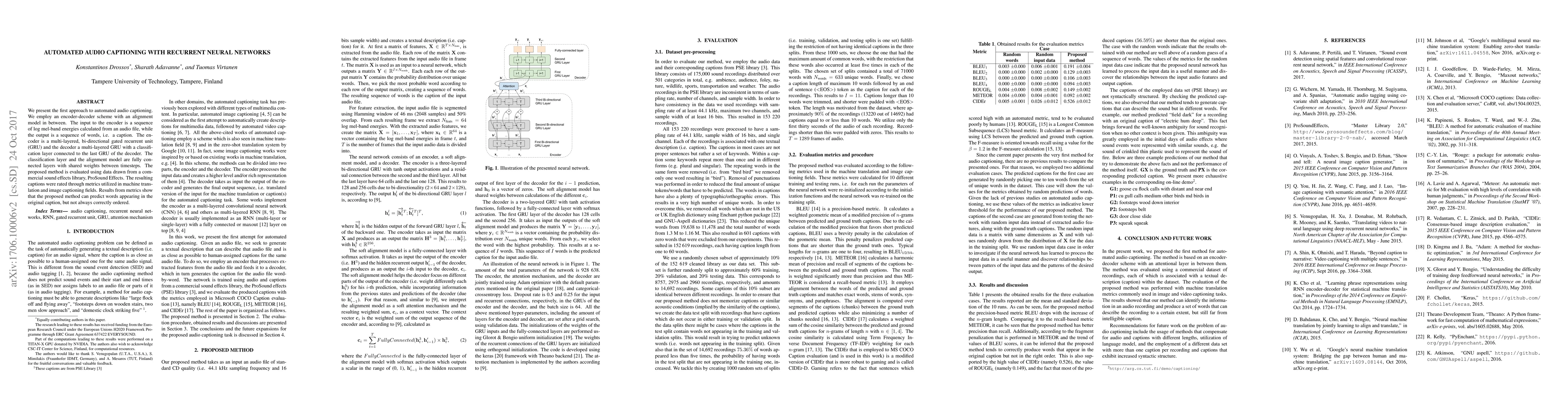 We present the first approach to automated audio captioning. We employ an encoder-decoder scheme with an alignment model in between. The input to the encoder is a sequence of log mel-band energies calculated from an audio file, while the output is a sequence of words, i.e. a caption. The encoder is a multi-layered, bi-directional gated recurrent unit (GRU) and the decoder a multi-layered GRU with a classification layer connected to the last GRU of the decoder. The classification layer and the alignment model are fully connected layers with shared weights between timesteps. The proposed method is evaluated using data drawn from a commercial sound effects library, ProSound Effects. The resulting captions were rated through metrics utilized in machine translation and image captioning fields. Results from metrics show that the proposed method can predict words appearing in the original caption, but not always correctly ordered.