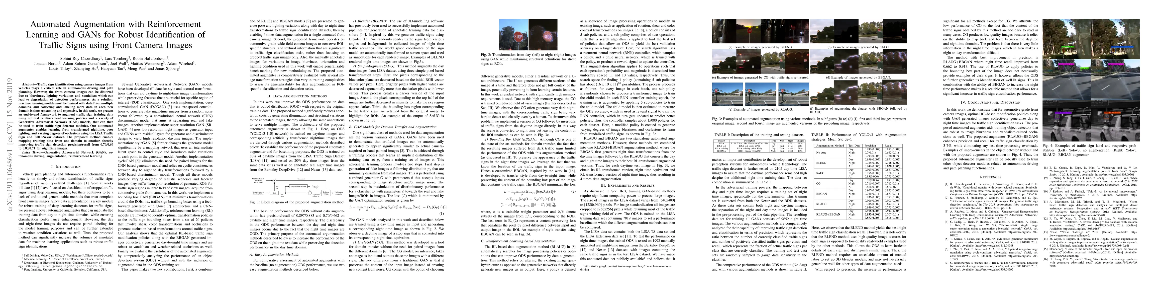 Traffic sign identification using camera images from vehicles plays a critical role in autonomous driving and path planning. However, the front camera images can be distorted due to blurriness, lighting variations and vandalism which can lead to degradation of detection performances. As a solution, machine learning models must be trained with data from multiple domains, and collecting and labeling more data in each new domain is time consuming and expensive. In this work, we present an end-to-end framework to augment traffic sign training data using optimal reinforcement learning policies and a variety of Generative Adversarial Network (GAN) models, that can then be used to train traffic sign detector modules. Our automated augmenter enables learning from transformed nightime, poor lighting, and varying degrees of occlusions using the LISA Traffic Sign and BDD-Nexar dataset. The proposed method enables mapping training data from one domain to another, thereby improving traffic sign detection precision/recall from 0.70/0.66 to 0.83/0.71 for nighttime images.