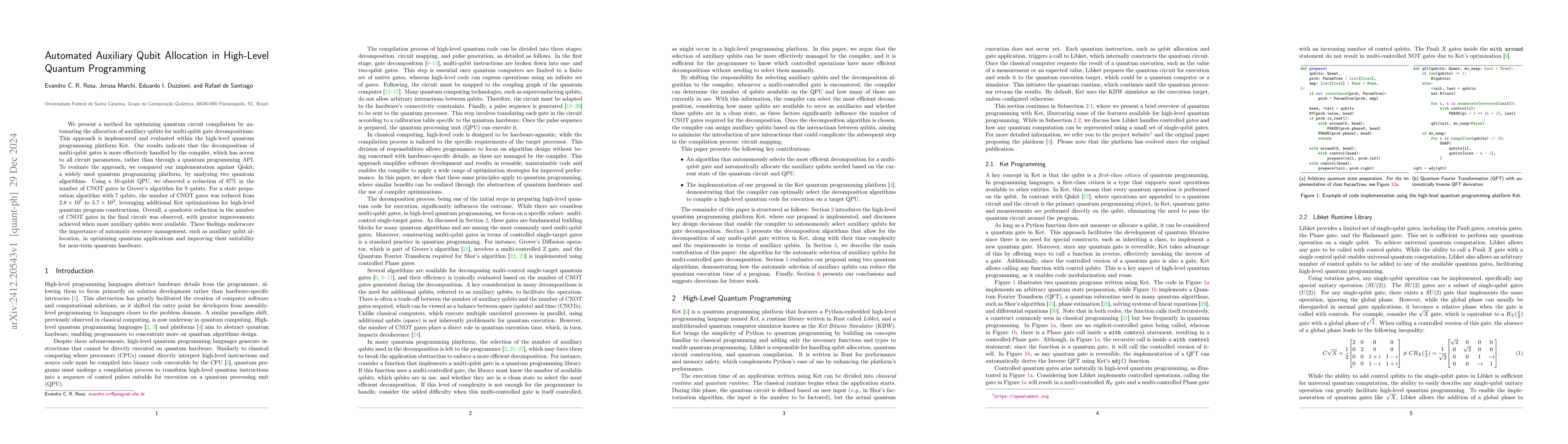 This paper proposes an automated method for optimizing quantum circuit compilation by efficiently allocating auxiliary qubits, demonstrating significant improvements in gate reduction for quantum algorithms on a 16-qubit QPU using the Ket platform. Compared to Qiskit, the approach led to an 87% decrease in CNOT gates in Grover’s algorithm and a substantial reduction in state preparation, highlighting the benefits of automated qubit management in quantum programming.