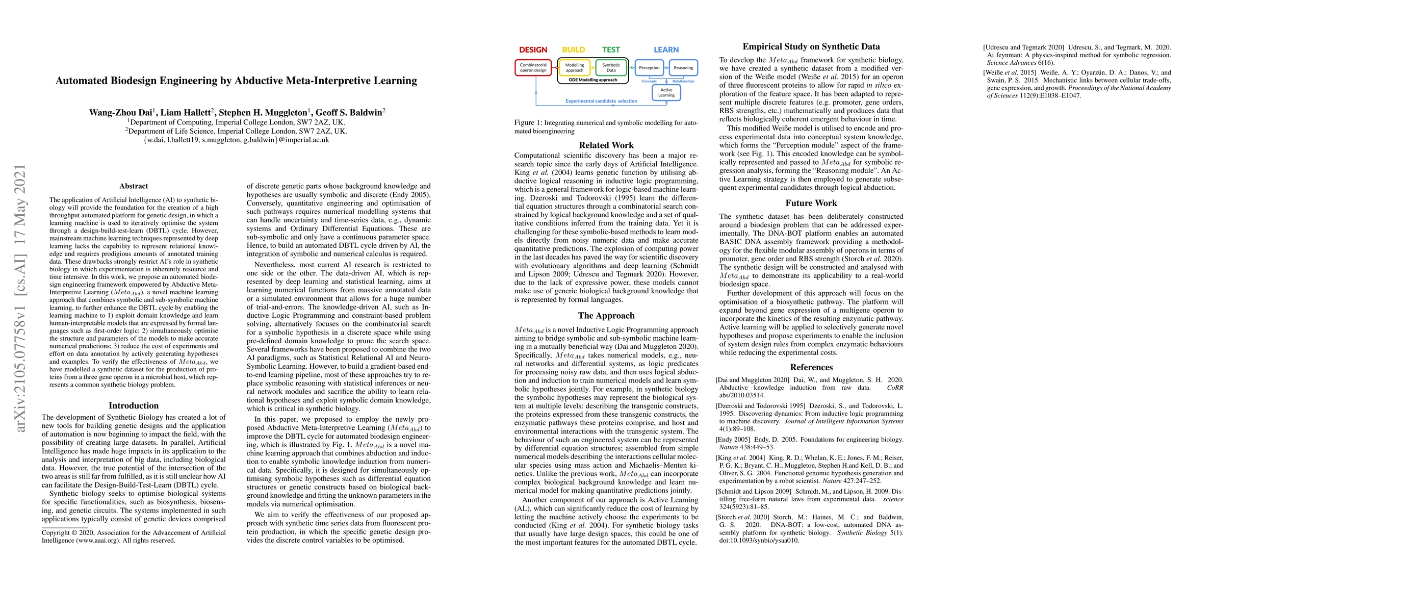 The application of Artificial Intelligence (AI) to synthetic biology will provide the foundation for the creation of a high throughput automated platform for genetic design, in which a learning machine is used to iteratively optimise the system through a design-build-test-learn (DBTL) cycle. However, mainstream machine learning techniques represented by deep learning lacks the capability to represent relational knowledge and requires prodigious amounts of annotated training data. These drawbacks strongly restrict AI's role in synthetic biology in which experimentation is inherently resource and time intensive. In this work, we propose an automated biodesign engineering framework empowered by Abductive Meta-Interpretive Learning ($Meta_{Abd}$), a novel machine learning approach that combines symbolic and sub-symbolic machine learning, to further enhance the DBTL cycle by enabling the learning machine to 1) exploit domain knowledge and learn human-interpretable models that are expressed by formal languages such as first-order logic; 2) simultaneously optimise the structure and parameters of the models to make accurate numerical predictions; 3) reduce the cost of experiments and effort on data annotation by actively generating hypotheses and examples. To verify the effectiveness of $Meta_{Abd}$, we have modelled a synthetic dataset for the production of proteins from a three gene operon in a microbial host, which represents a common synthetic biology problem.