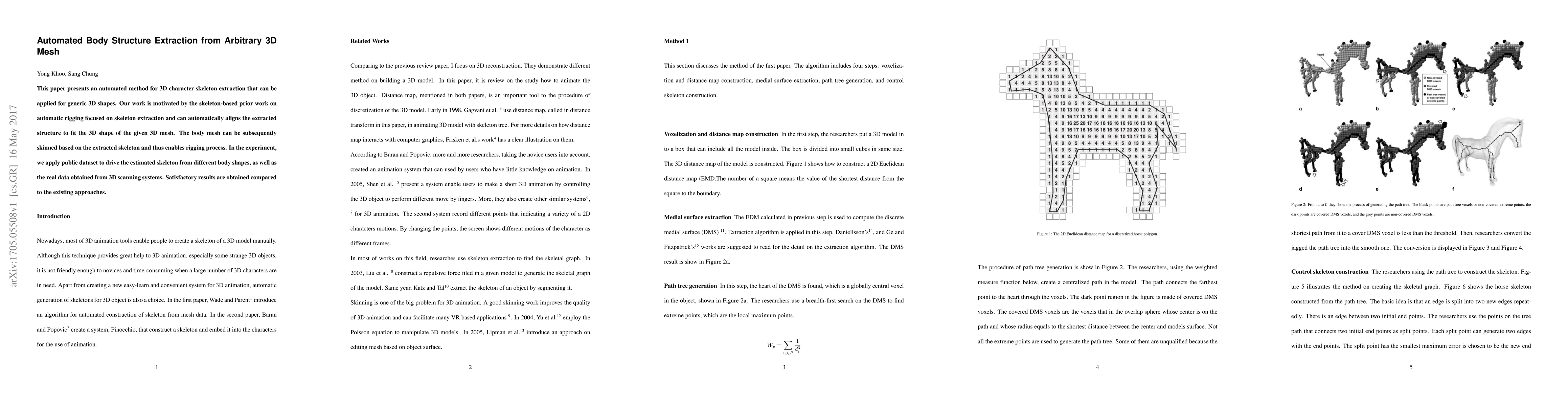 This paper introduces an automated method for extracting skeletons from arbitrary 3D meshes, enabling subsequent rigging processes. Experimental results on both public datasets and real 3D scans show satisfactory performance compared to existing methods.