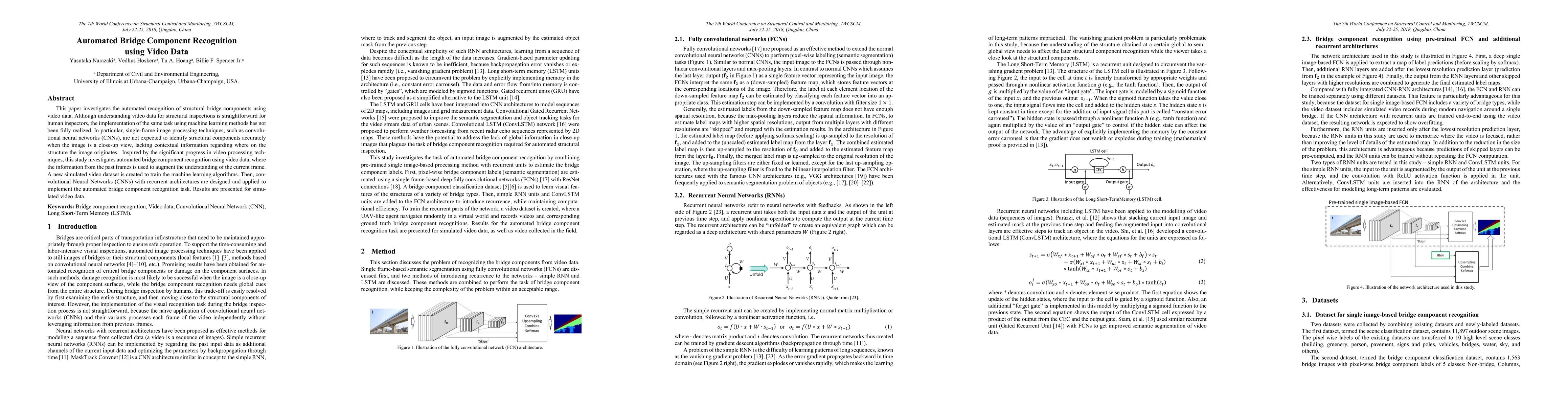 This paper explores the automated recognition of bridge components using video data, leveraging recurrent convolutional neural networks to utilize contextual information from past frames. The study introduces a new simulated video dataset and demonstrates the effectiveness of the proposed method on both simulated and real field video data.