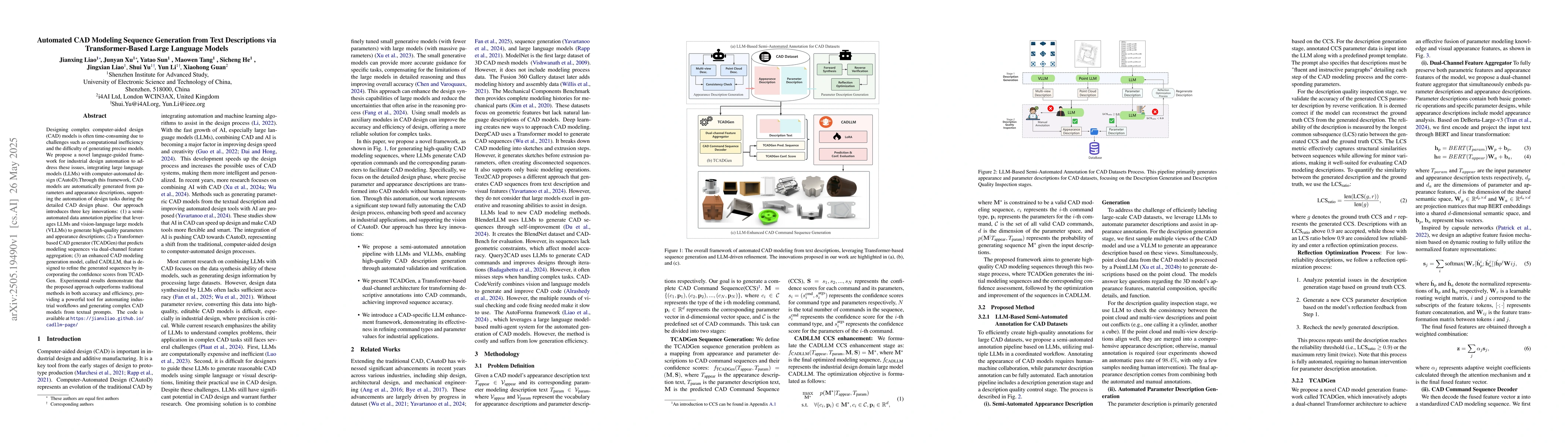 The research proposes a novel framework integrating large language models (LLMs) with computer-automated design (CAutoD) for automated CAD modeling sequence generation from text descriptions, utilizing a semi-automated data annotation pipeline, Transformer-based CAD generator (TCADGen), and an enhanced CAD modeling generation model (CADLLM).