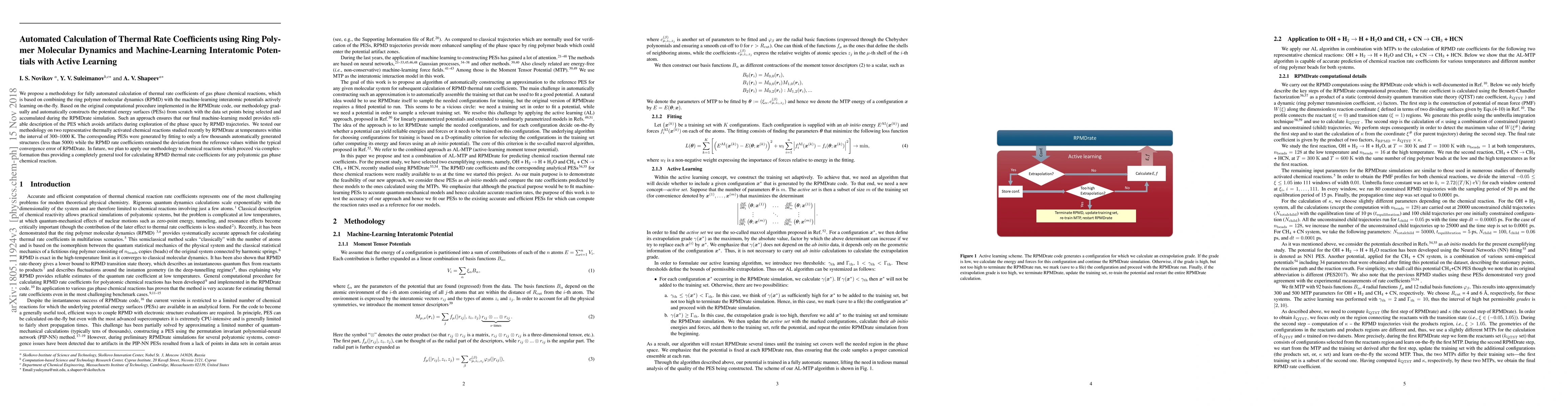 We propose a methodology for fully automated calculation of thermal rate coefficients of gas phase chemical reactions, which is based on combining the ring polymer molecular dynamics (RPMD) with the machine-learning interatomic potentials actively learning on-the-fly. Based on the original computational procedure implemented in the RPMDrate code, our methodology gradually and automatically constructs the potential energy surfaces (PESs) from scratch with the data set points being selected and accumulated during the RPMDrate simulation. Such an approach ensures that our final machine-learning model provides reliable description of the PES which avoids artifacts during exploration of the phase space by RPMD trajectories. We tested our methodology on two representative thermally activated chemical reactions studied recently by RPMDrate at temperatures within the interval of 300--1000~K. The corresponding PESs were generated by fitting to only a few thousands automatically generated structures (less than 5000) while the RPMD rate coefficients retained the deviation from the reference values within the typical convergence error of RPMDrate. In future, we plan to apply our methodology to chemical reactions which proceed via complex-formation thus providing a completely general tool for calculating RPMD thermal rate coefficients for any polyatomic gas phase chemical reaction.