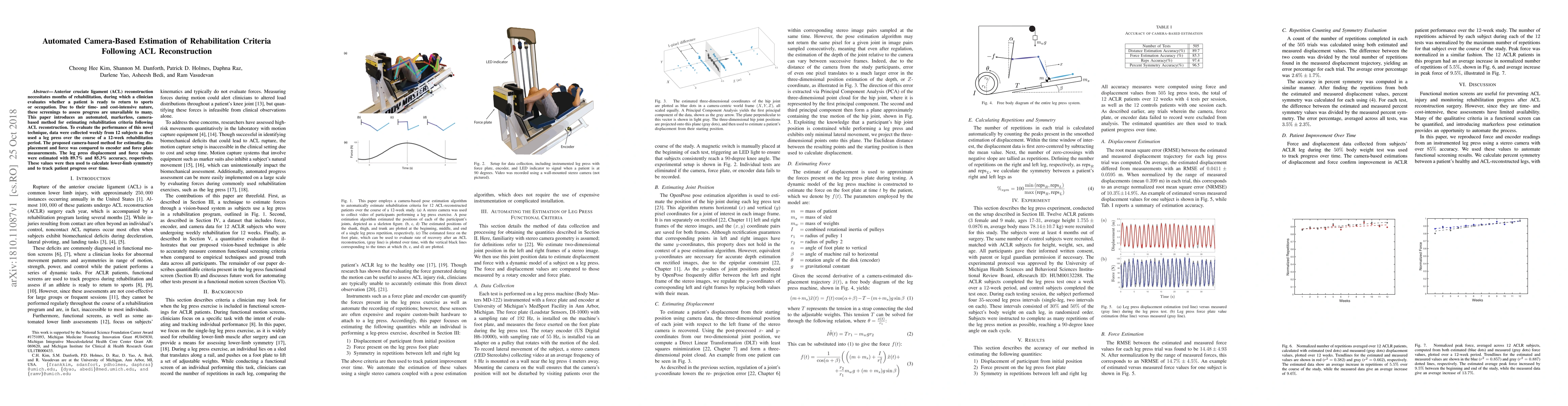 The paper presents a markerless, camera-based pose estimation algorithm for automated estimation of rehabilitation criteria in ACL reconstruction patients, specifically focusing on displacement, force, repetitions, and symmetry.