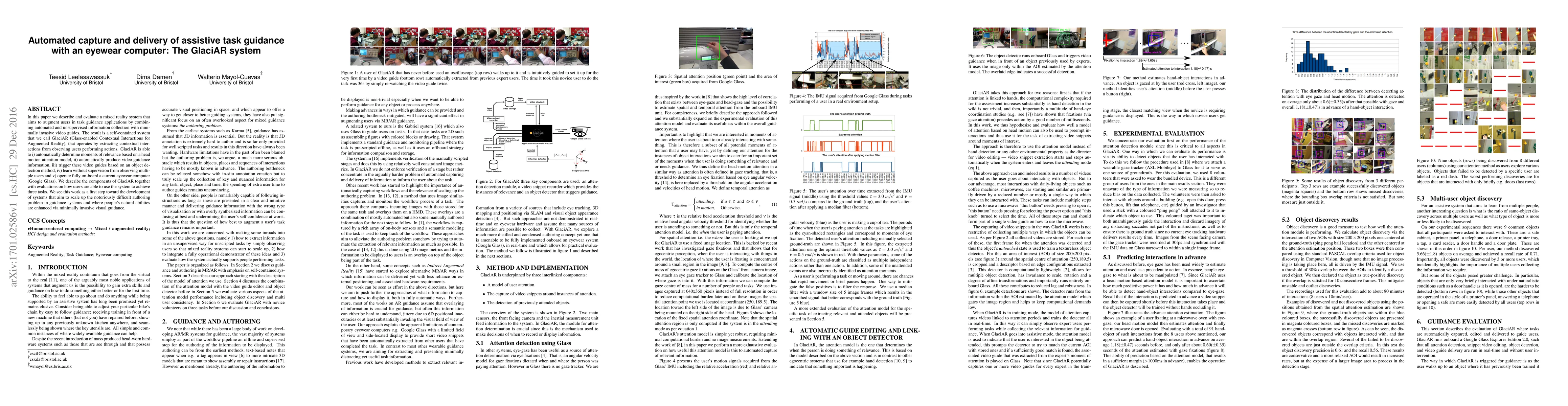 The GlaciAR system is a mixed reality eyewear computer that autonomously captures and delivers task guidance by analyzing user interactions and generating minimally invasive video guides. The system learns from multiple users and operates fully on Google Glass, aiming to address the challenges in authoring guidance systems.