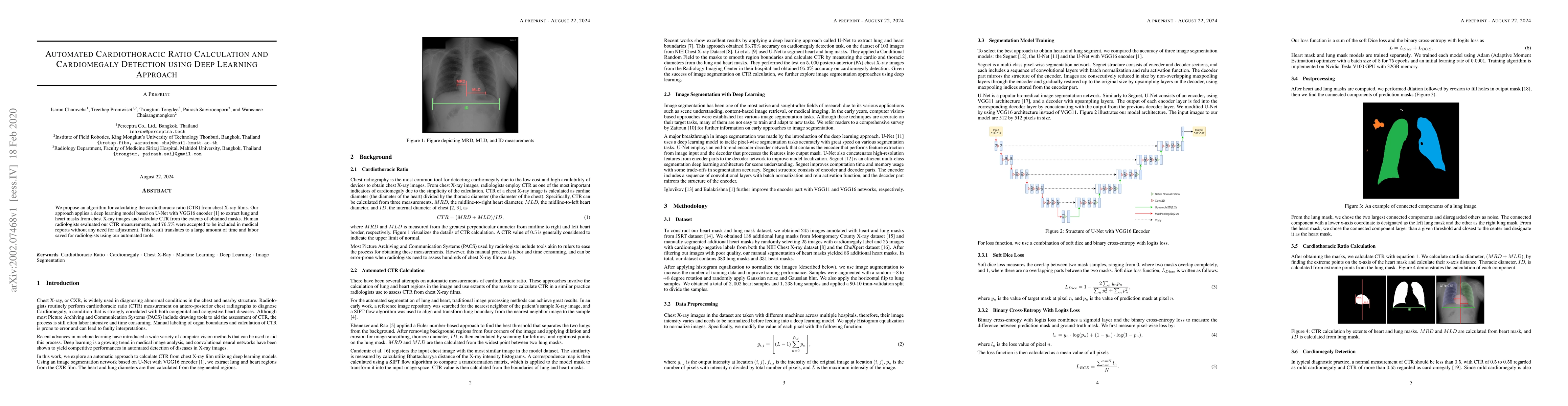 This research proposes a deep learning algorithm using a U-Net model with VGG16 encoder to automatically calculate the cardiothoracic ratio from chest X-rays, achieving 76.5% acceptance by radiologists, thereby significantly reducing the time and effort required for manual measurements.