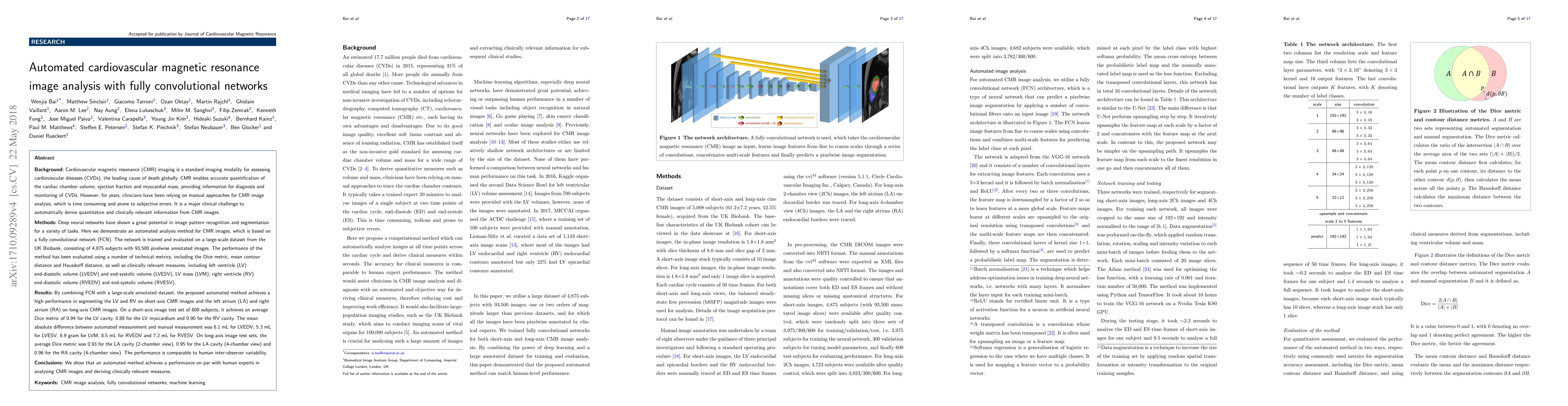 This paper presents an automated cardiovascular magnetic resonance (CMR) image analysis method using fully convolutional networks (FCNs), achieving high performance in segmenting cardiac chambers and quantifying volumes, comparable to manual expert analysis, thus addressing the challenge of time-consuming and error-prone manual CMR image analysis.