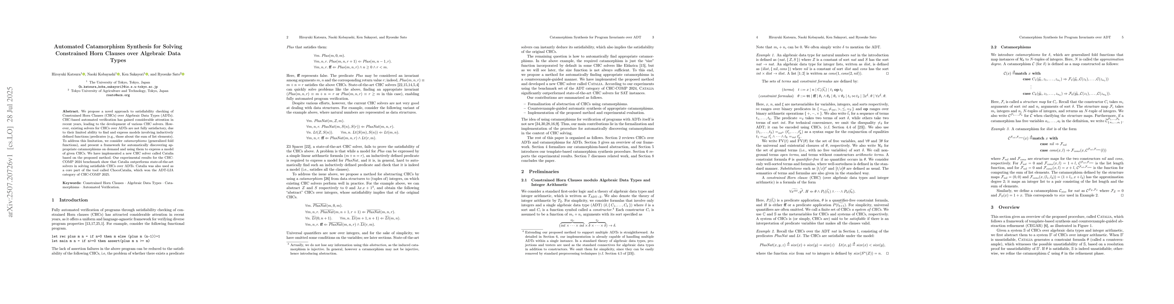 We propose a novel approach to satisfiability checking of Constrained Horn Clauses (CHCs) over Algebraic Data Types (ADTs). CHC-based automated verification has gained considerable attention in recent years, leading to the development of various CHC solvers. However, existing solvers for CHCs over ADTs are not fully satisfactory, due to their limited ability to find and express models involving inductively defined functions/predicates (e.g., those about the sum of list elements). To address this limitation, we consider catamorphisms (generalized fold functions), and present a framework for automatically discovering appropriate catamorphisms on demand and using them to express a model of given CHCs. We have implemented a new CHC solver called Catalia based on the proposed method. Our experimental results for the CHC-COMP 2024 benchmark show that Catalia outperforms state-of-the-art solvers in solving satisfiable CHCs over ADTs. Catalia was also used as a core part of the tool called ChocoCatalia, which won the ADT-LIA category of CHC-COMP 2025.