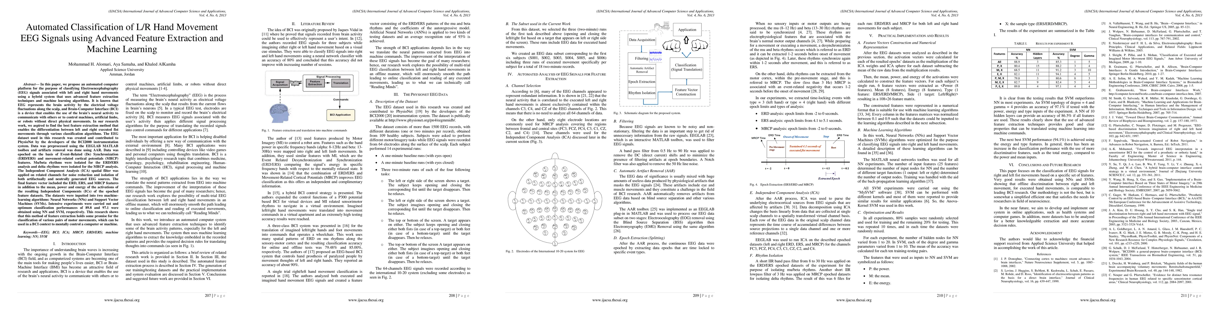 This paper presents an automated platform for classifying EEG signals from left and right hand movements using advanced feature extraction and machine learning. The study achieved high classification accuracies of 89.8% and 97.1% using Neural Networks and Support Vector Machines, respectively.