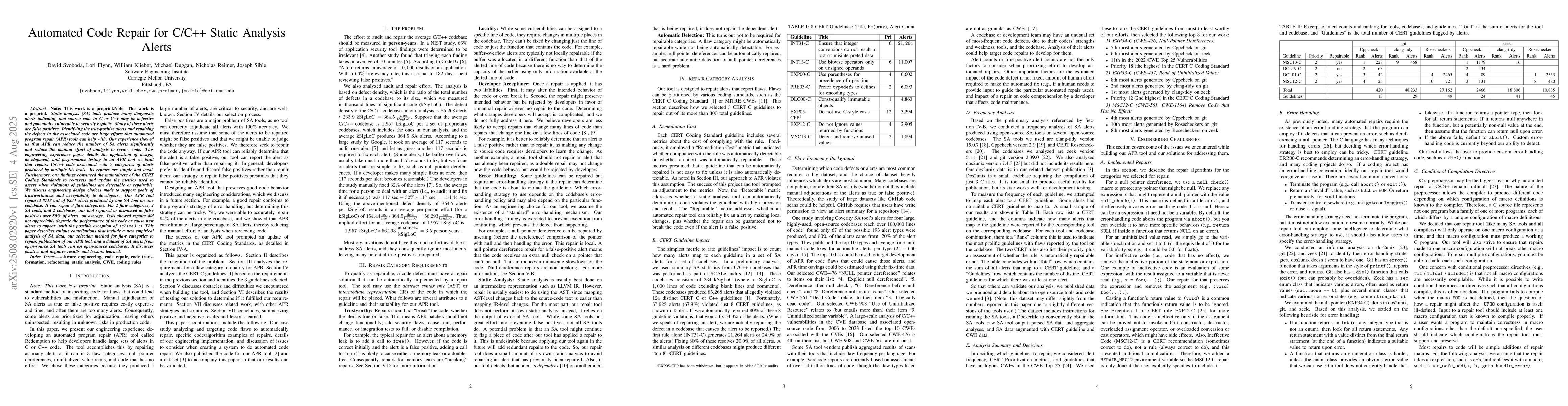 (Note: This work is a preprint.) Static analysis (SA) tools produce many diagnostic alerts indicating that source code in C or C++ may be defective and potentially vulnerable to security exploits. Many of these alerts are false positives. Identifying the true-positive alerts and repairing the defects in the associated code are huge efforts that automated program repair (APR) tools can help with. Our experience showed us that APR can reduce the number of SA alerts significantly and reduce the manual effort of analysts to review code. This engineering experience paper details the application of design, development, and performance testing to an APR tool we built that repairs C/C++ code associated with 3 categories of alerts produced by multiple SA tools. Its repairs are simple and local. Furthermore, our findings convinced the maintainers of the CERT Coding Standards to re-assess and update the metrics used to assess when violations of guidelines are detectable or repairable. We discuss engineering design choices made to support goals of trustworthiness and acceptability to developers. Our APR tool repaired 8718 out of 9234 alerts produced by one SA tool on one codebase. It can repair 3 flaw categories. For 2 flaw categories, 2 SA tools, and 2 codebases, our tool repaired or dismissed as false positives over 80% of alerts, on average. Tests showed repairs did not appreciably degrade the performance of the code or cause new alerts to appear (with the possible exception of sqlite3.c). This paper describes unique contributions that include a new empirical analysis of SA data, our selection method for flaw categories to repair, publication of our APR tool, and a dataset of SA alerts from open-source SA tools run on open-source codebases. It discusses positive and negative results and lessons learned.