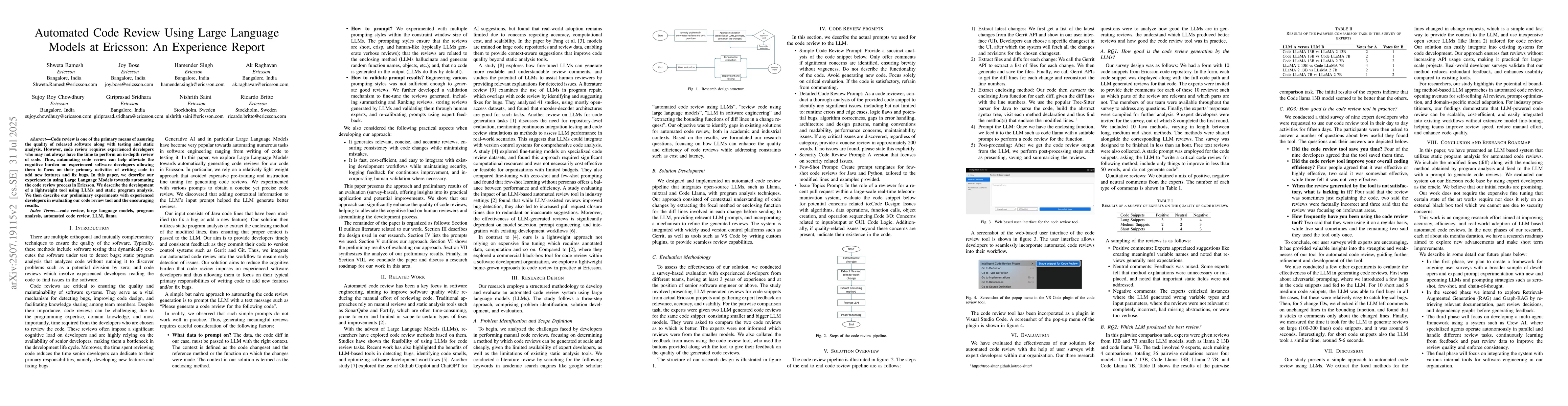 Code review is one of the primary means of assuring the quality of released software along with testing and static analysis. However, code review requires experienced developers who may not always have the time to perform an in-depth review of code. Thus, automating code review can help alleviate the cognitive burden on experienced software developers allowing them to focus on their primary activities of writing code to add new features and fix bugs. In this paper, we describe our experience in using Large Language Models towards automating the code review process in Ericsson. We describe the development of a lightweight tool using LLMs and static program analysis. We then describe our preliminary experiments with experienced developers in evaluating our code review tool and the encouraging results.