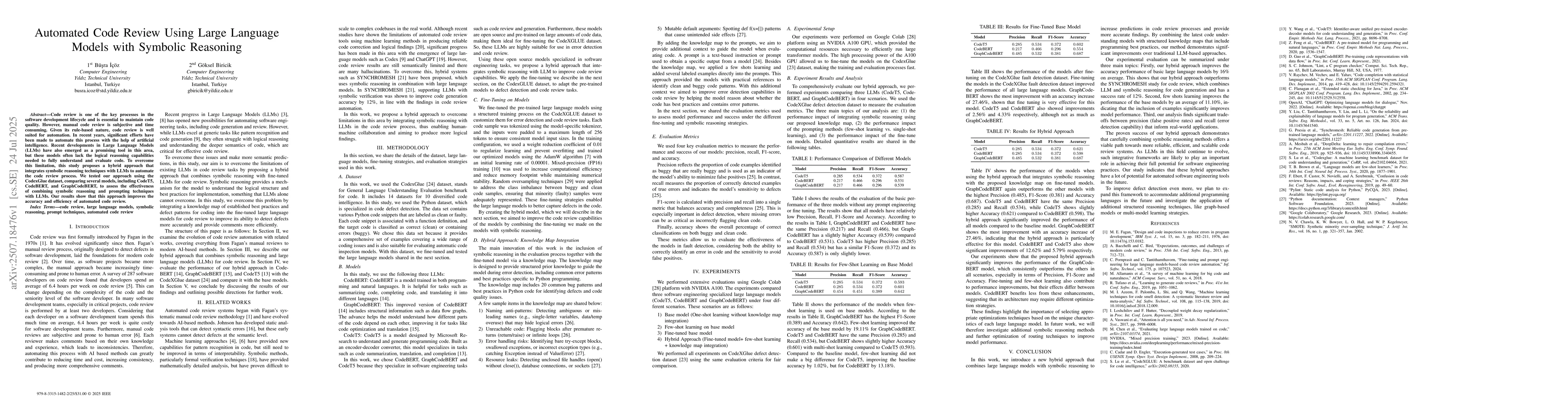 This work distinguishes itself by integrating symbolic reasoning with fine-tuned LLMs, demonstrating significant improvements over traditional LLM-based approaches for code review.