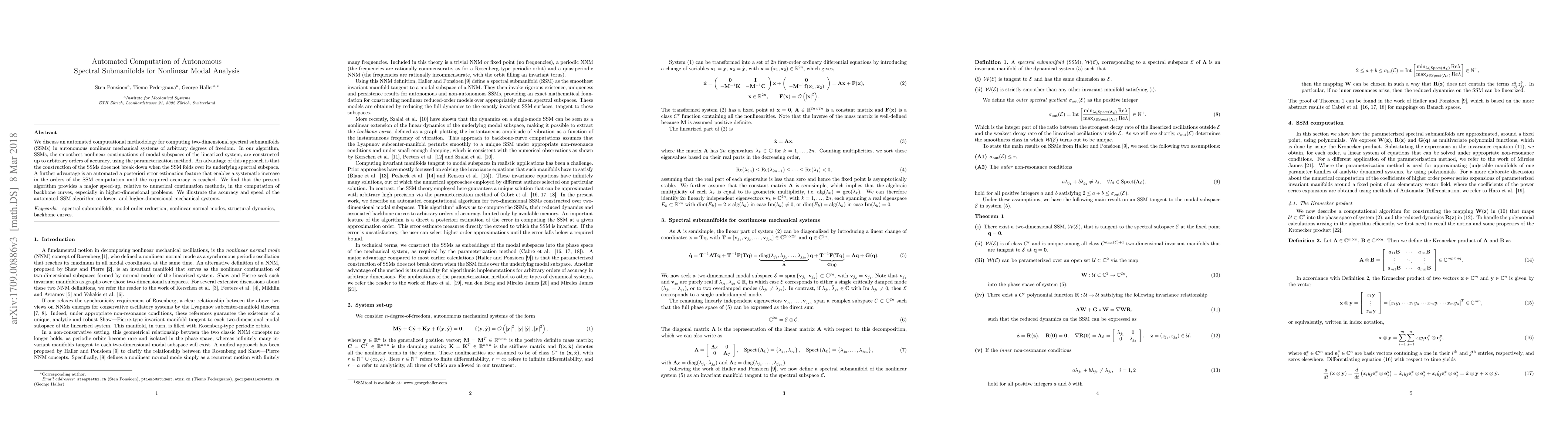 We discuss an automated computational methodology for computing two-dimensional spectral submanifolds (SSMs) in autonomous nonlinear mechanical systems of arbitrary degrees of freedom. In our algorithm, SSMs, the smoothest nonlinear continuations of modal subspaces of the linearized system, are constructed up to arbitrary orders of accuracy, using the parameterization method. An advantage of this approach is that the construction of the SSMs does not break down when the SSM folds over its underlying spectral subspace. A further advantage is an automated a posteriori error estimation feature that enables a systematic increase in the orders of the SSM computation until the required accuracy is reached. We find that the present algorithm provides a major speed-up, relative to numerical continuation methods, in the computation of backbone curves, especially in higher-dimensional problems. We illustrate the accuracy and speed of the automated SSM algorithm on lower- and higher-dimensional mechanical systems.