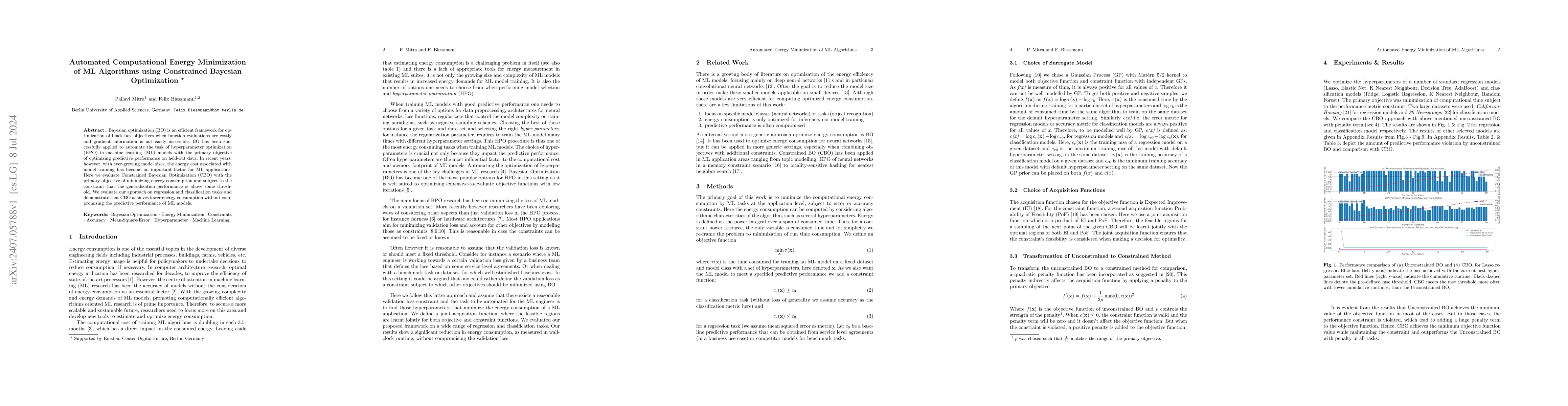 This paper proposes using Constrained Bayesian Optimization (CBO) to minimize energy consumption in machine learning models while maintaining predictive performance, achieving lower energy use without sacrificing accuracy on regression and classification tasks.